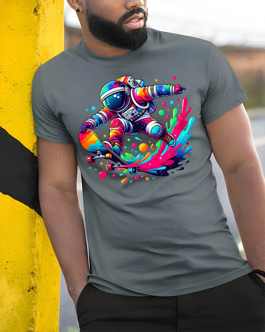 This graphic t shirt is made from soft comfortable fabric that feels smooth and breathable throughout the day. The high quality print keeps the colors bright and detailed even after many washes. This shirt is perfect for casual wear, streetwear style, parties, outdoor activities, or everyday outfits. The fun astronaut skateboard design brings creativity, energy, and space vibes into your fashion style.
