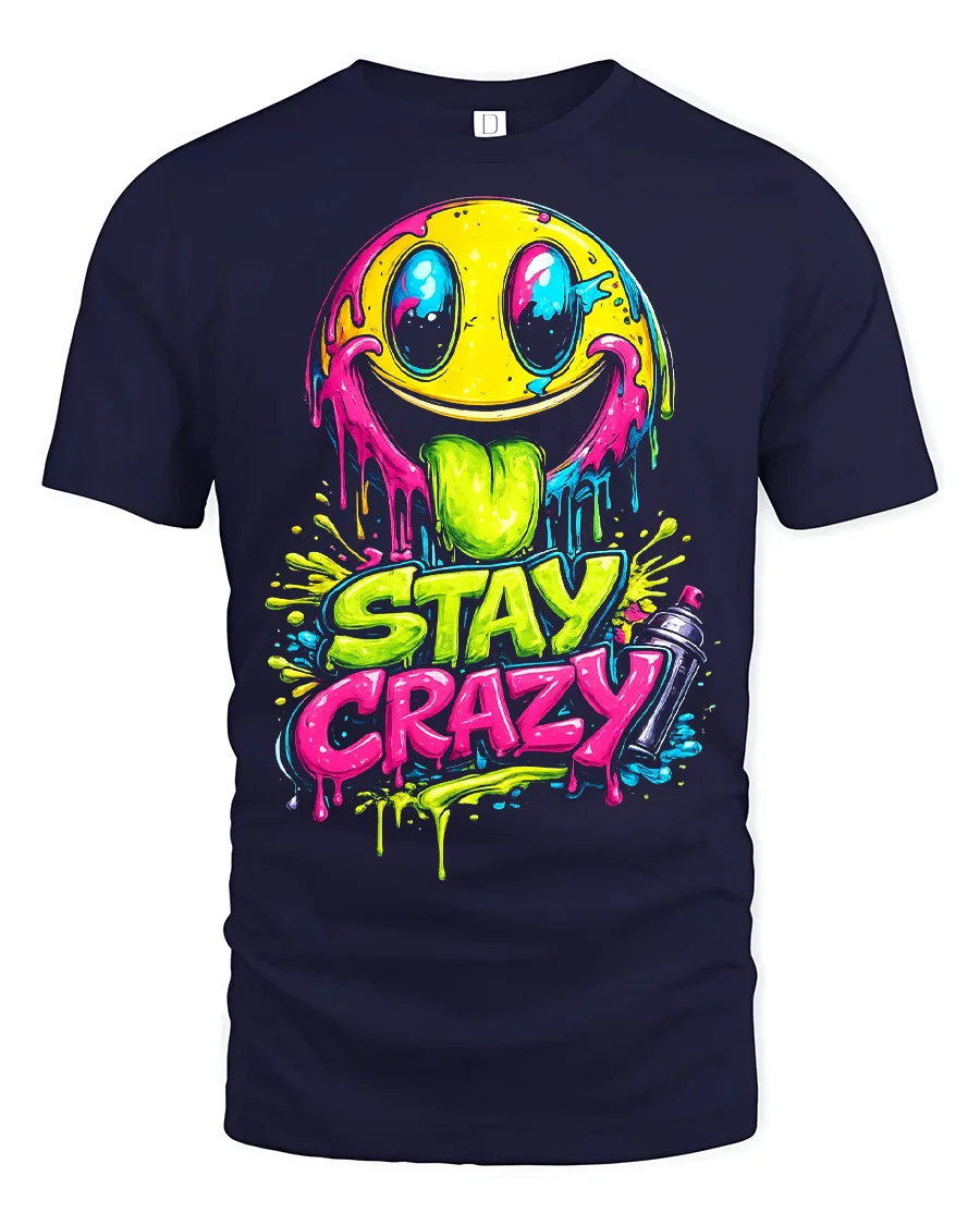 Stay Crazy Smiley Face Graffiti Tshirt Neon Street Art Vibe brings bold personality and vibrant energy into everyday style.