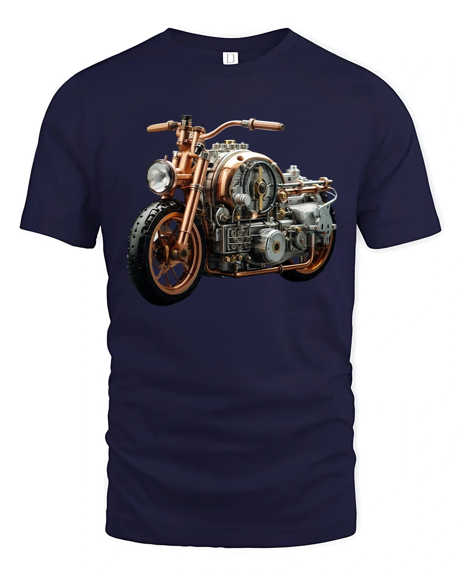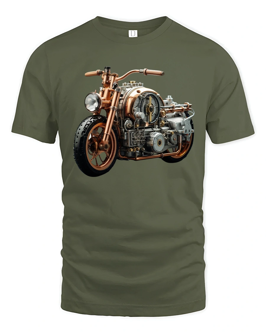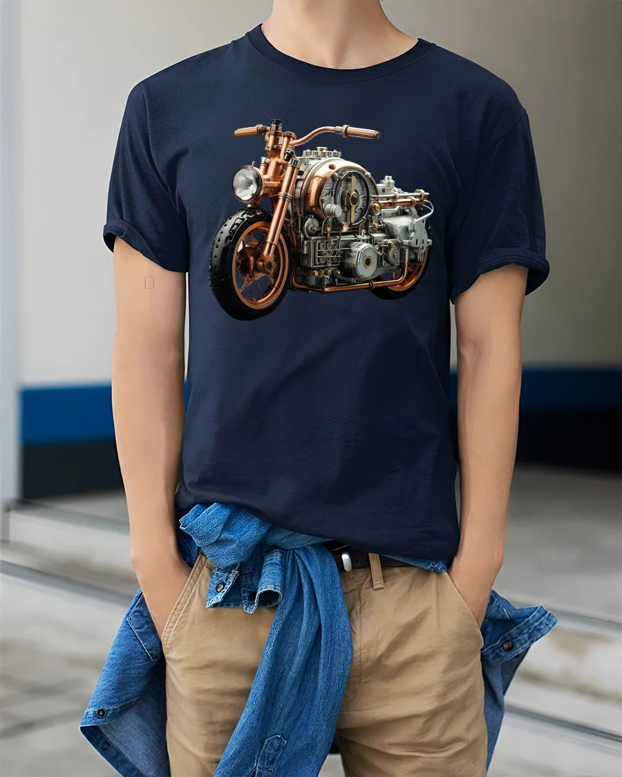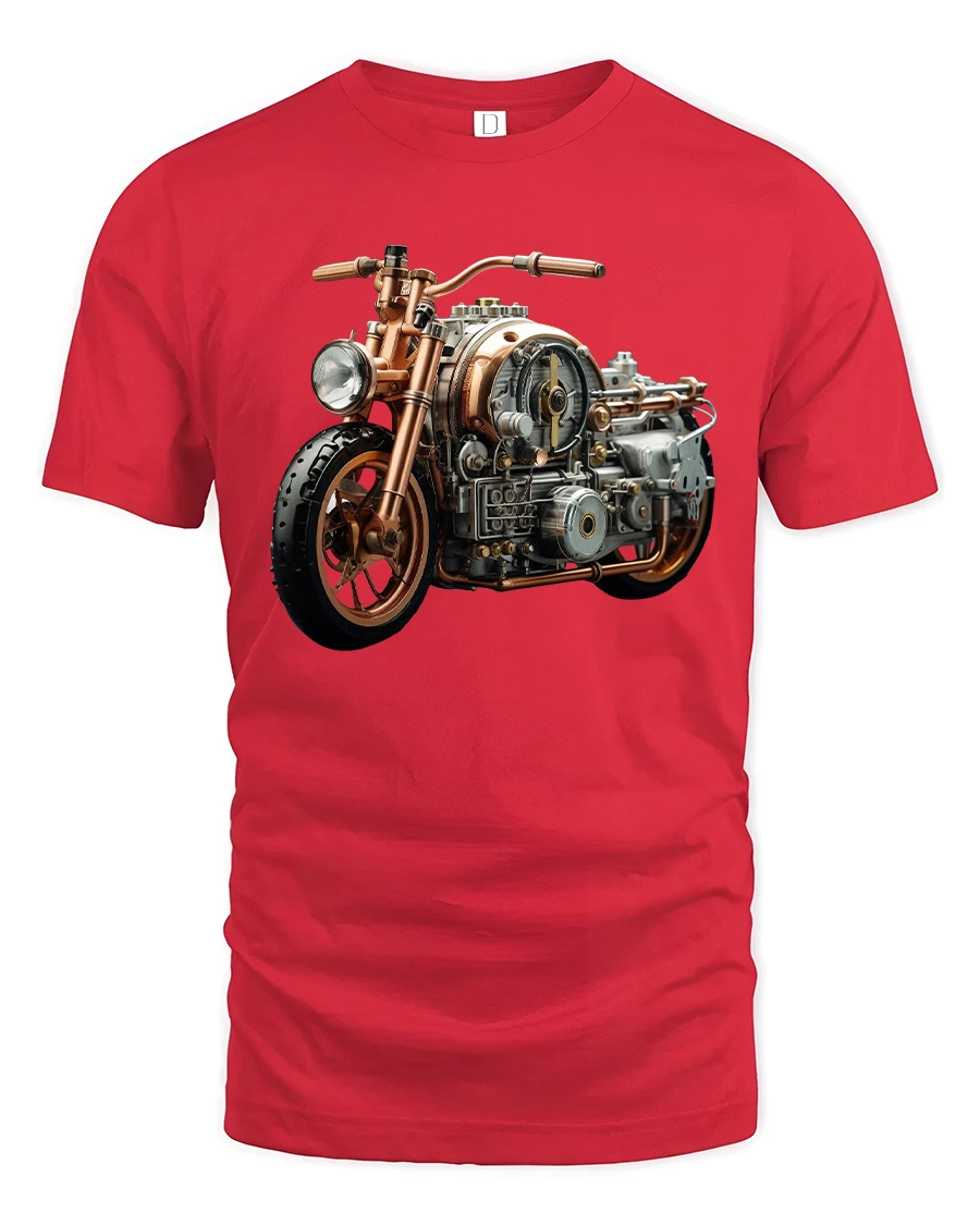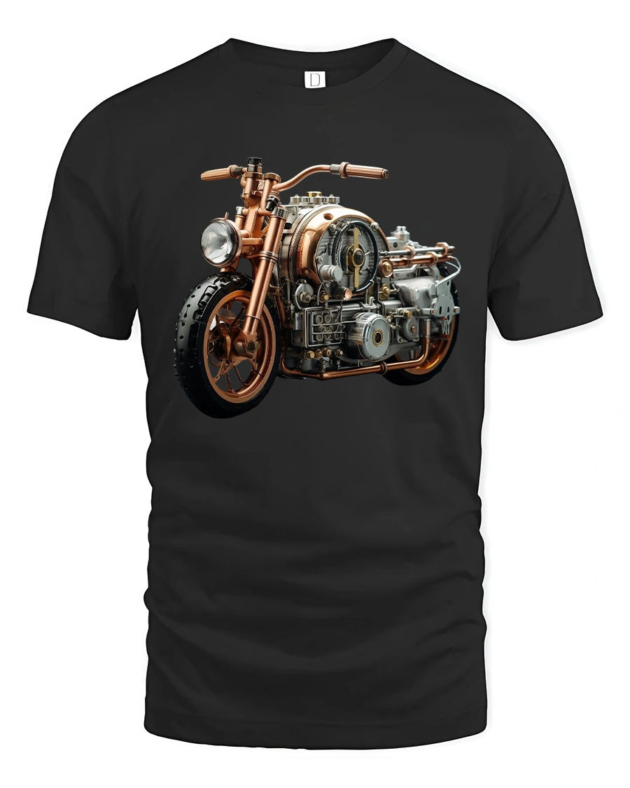 Turn heads with the Steampunk Motorcycle Engine Graphic Printed T-Shirt, a bold design that blends classic biker culture with intricate steampunk artistry. Featuring a highly detailed motorbike made of copper gears, pipes, and mechanical parts, this tee is perfect for motorcycle enthusiasts and fans of industrial-inspired fashion. Its unique design captures the power of the road and the creativity of steampunk aesthetics, making it a standout piece in any casual wardrobe.