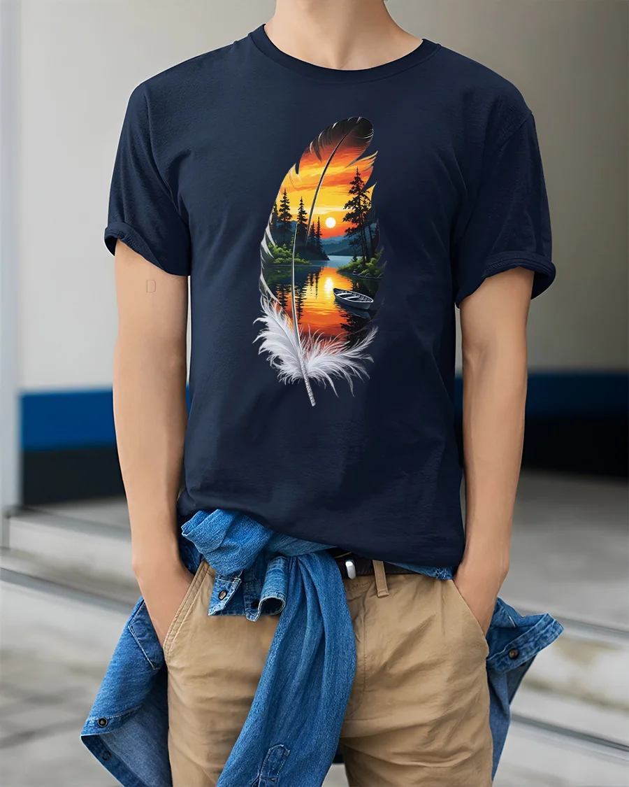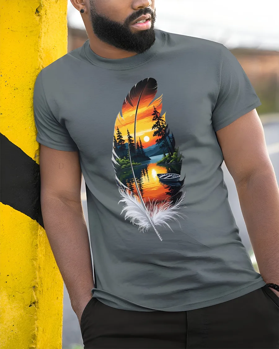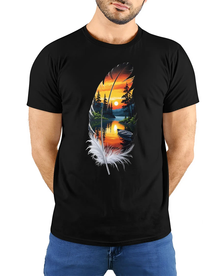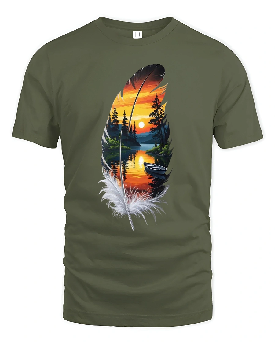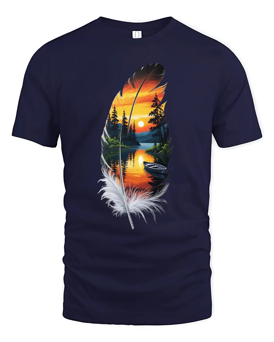 This tee also makes a thoughtful gift for outdoor enthusiasts, travelers, and nature lovers who enjoy scenic landscapes. With its soft, lightweight feel and eye-catching artwork, this shirt is ideal for vacations, weekend adventures, or cozy days at home. The sunset feather design brings calmness and inspiration wherever you go.