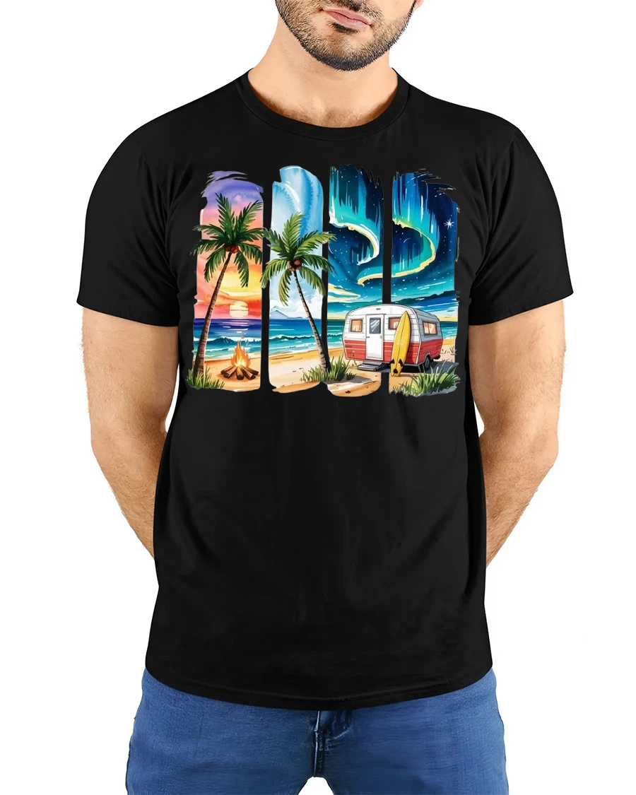 Escape into a laid back lifestyle with this surf beach sunset t shirt featuring a vibrant tropical camper and ocean scene.