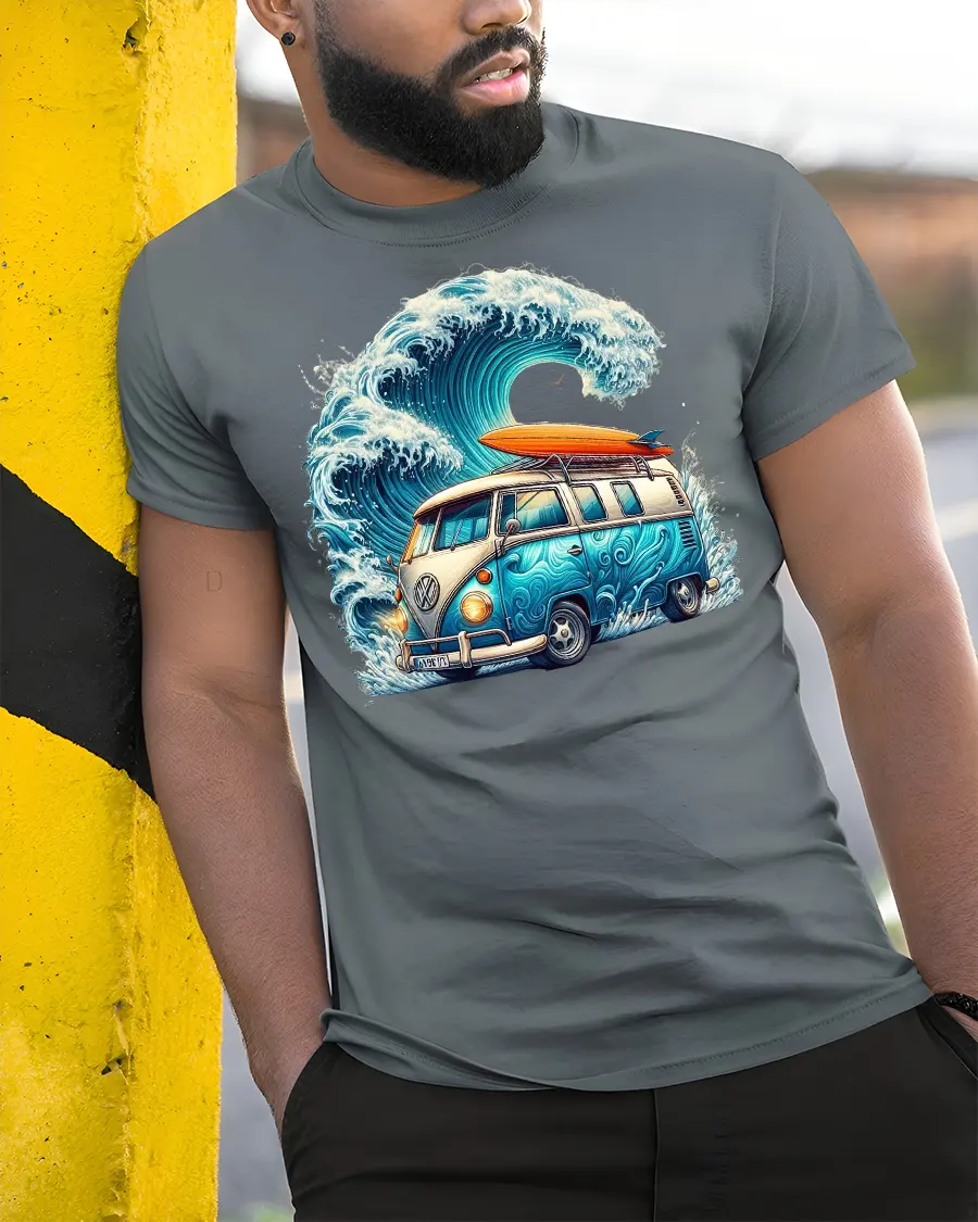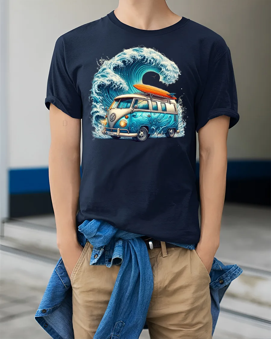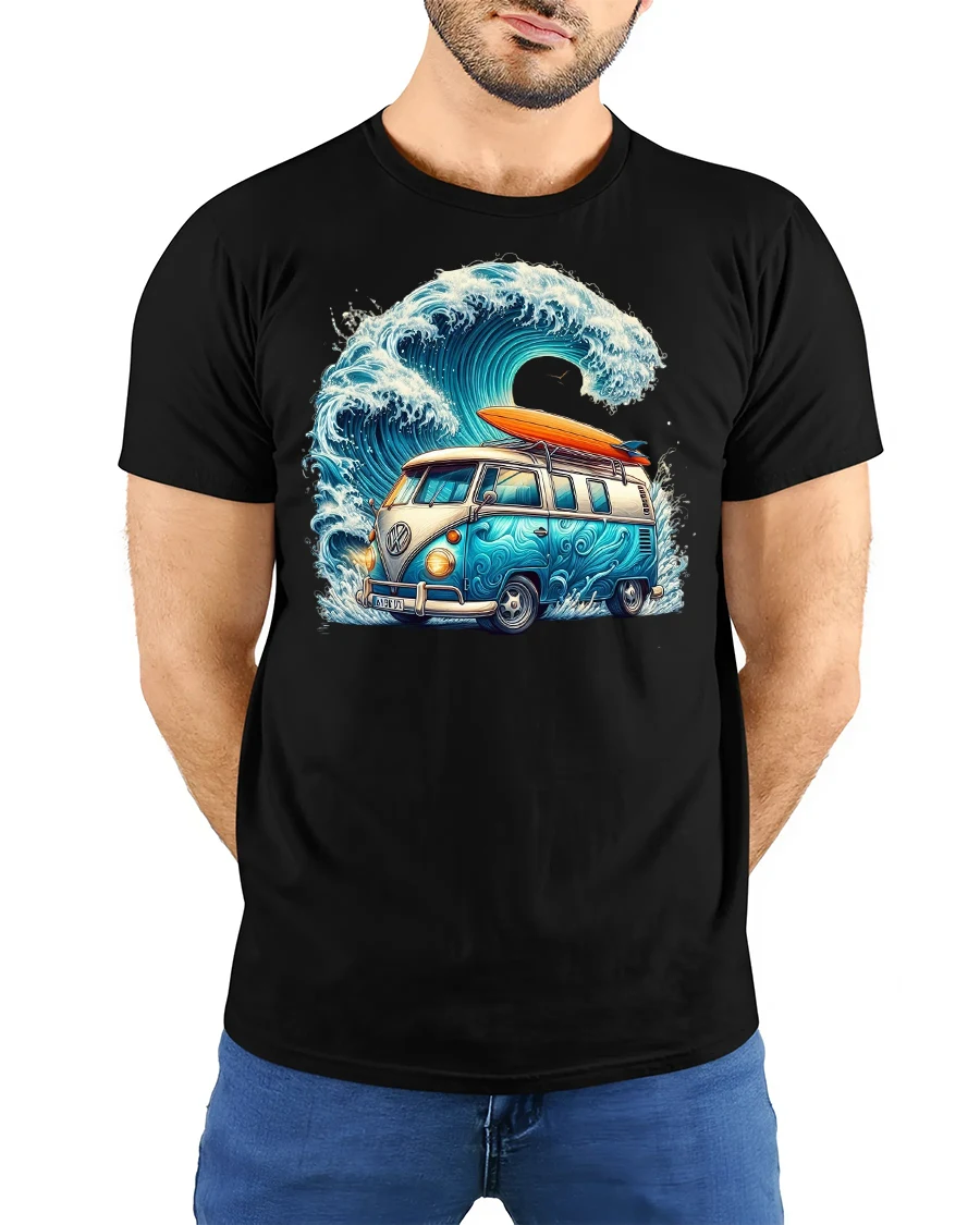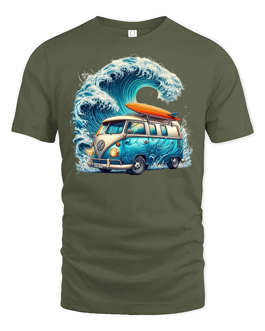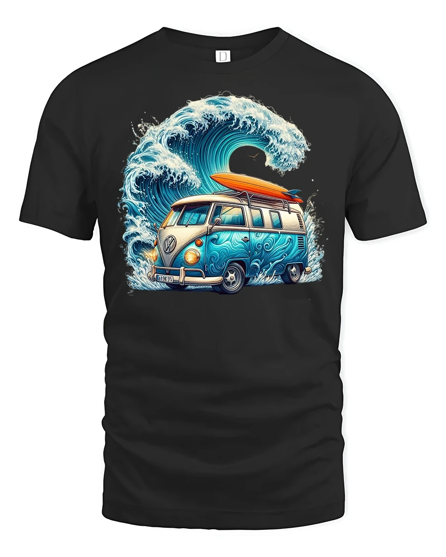 Hit the beach in style with the Surf Van Wave Rider Ocean Adventure T-Shirt. Featuring a retro surf van riding alongside a massive ocean wave, this tee is the ultimate choice for surfers, beach lovers, and anyone chasing that endless summer vibe. The vibrant design captures the spirit of surf culture, freedom, and adventure by the sea.