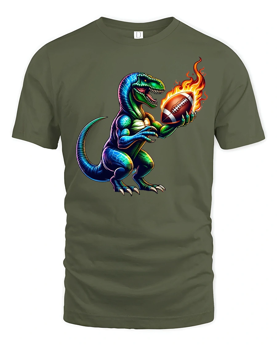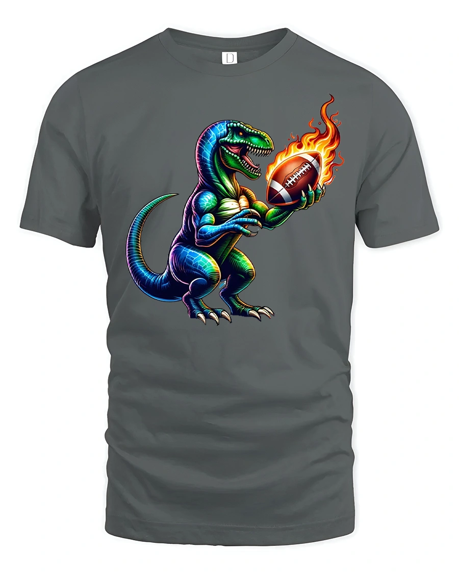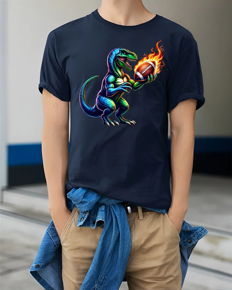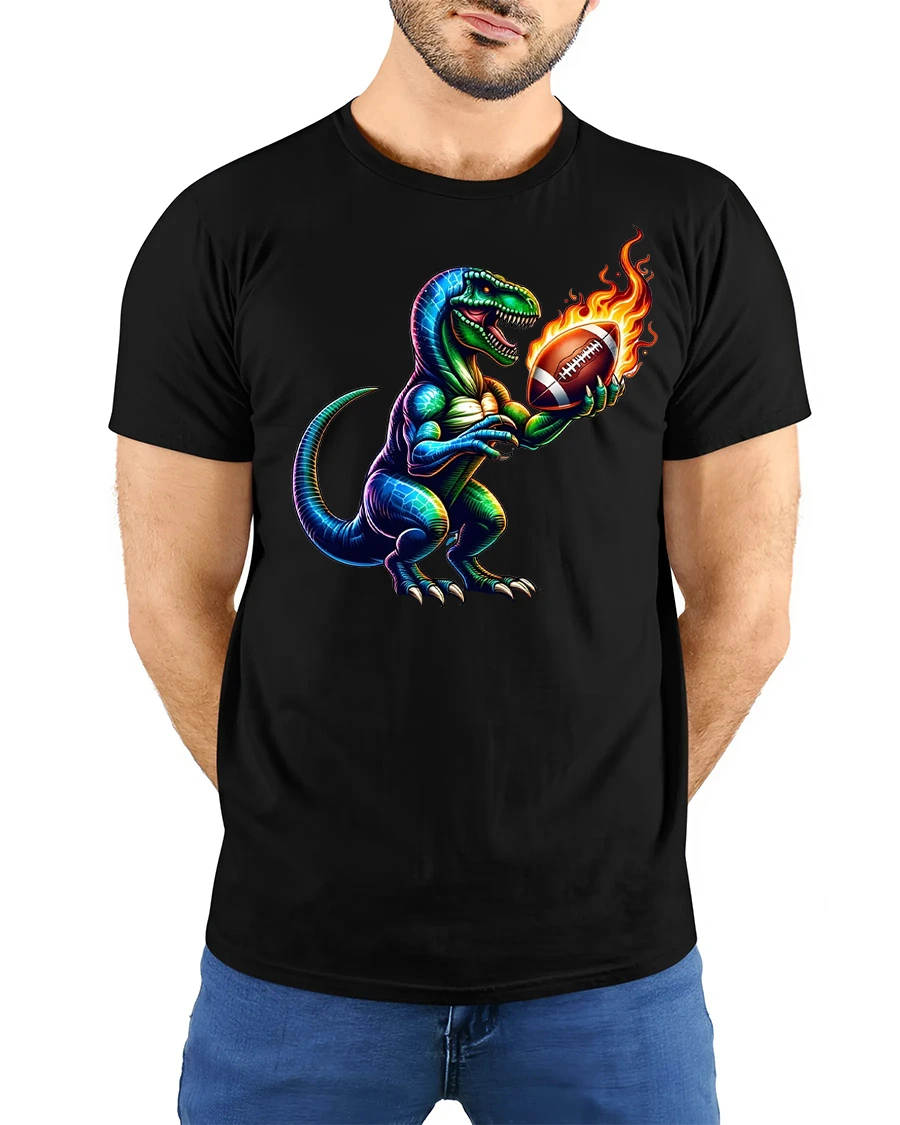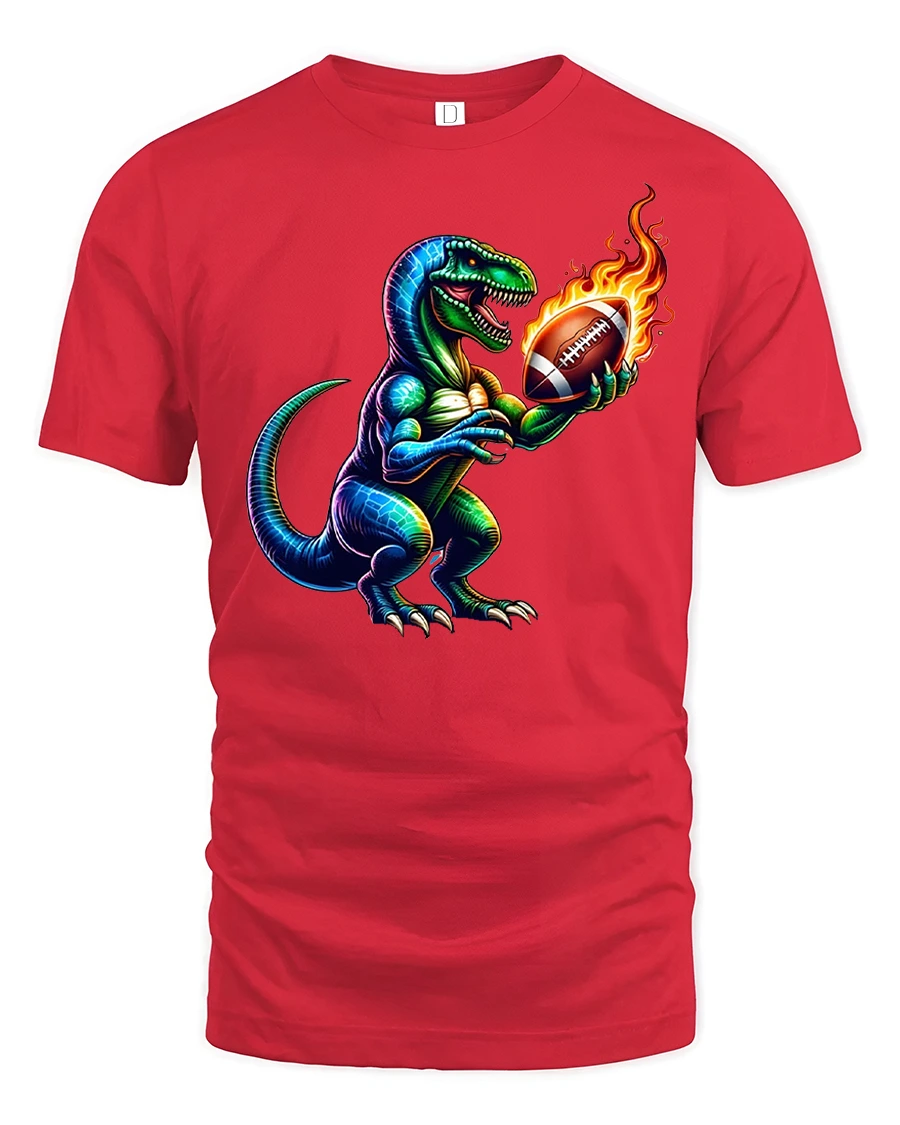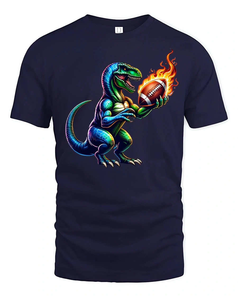 Made from soft and breathable fabric, this tshirt delivers comfort whether you’re tailgating, cheering from the bleachers, or relaxing at home. The premium print keeps every detail sharp—from the T-Rex’s scales to the fiery glow of the ball—ensuring long-lasting color and durability through frequent washes.
