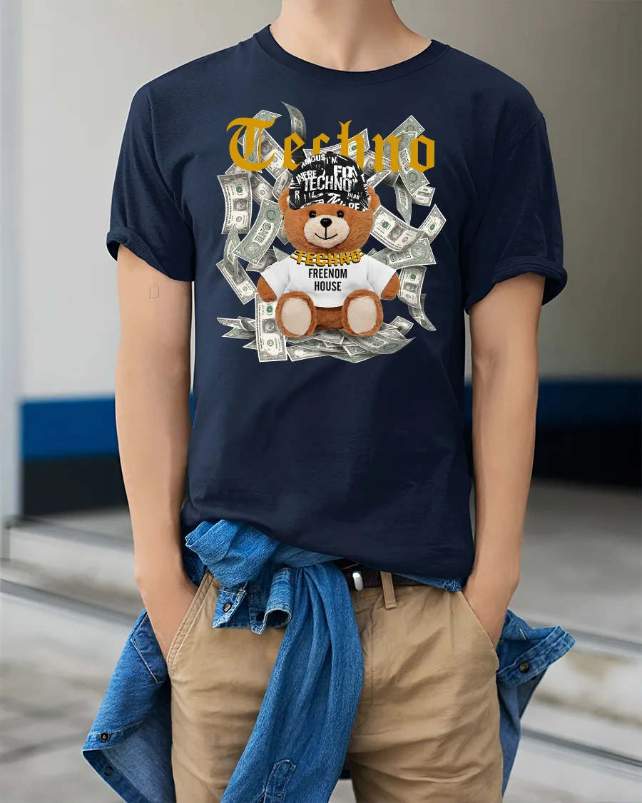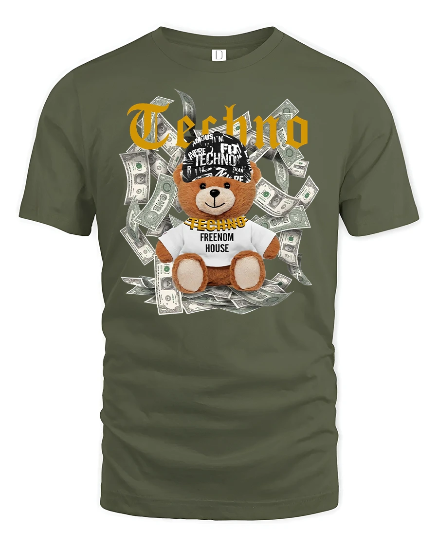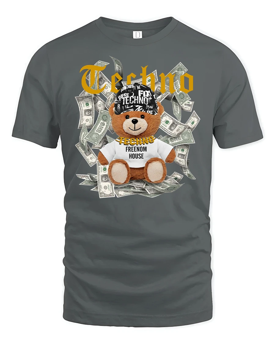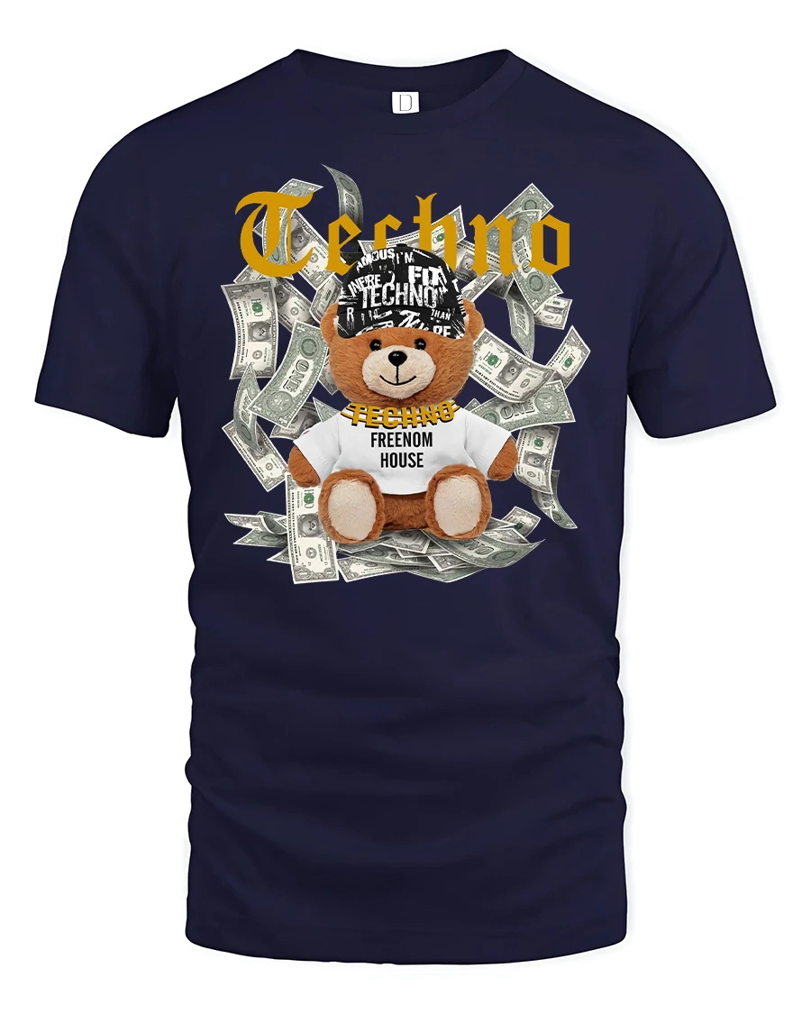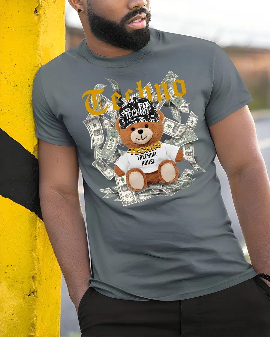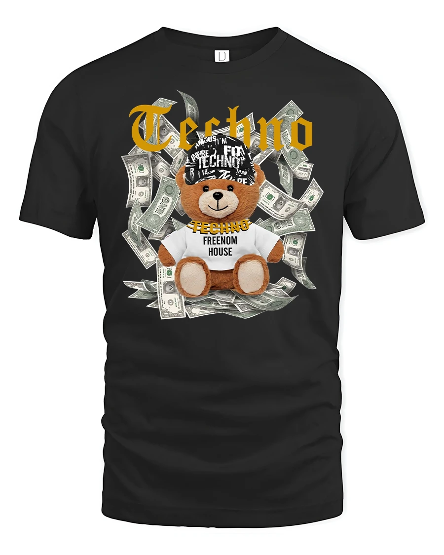 Featuring a cool teddy bear surrounded by dollar bills and the iconic “Techno” print, this tee is made for music lovers who live for the beat.