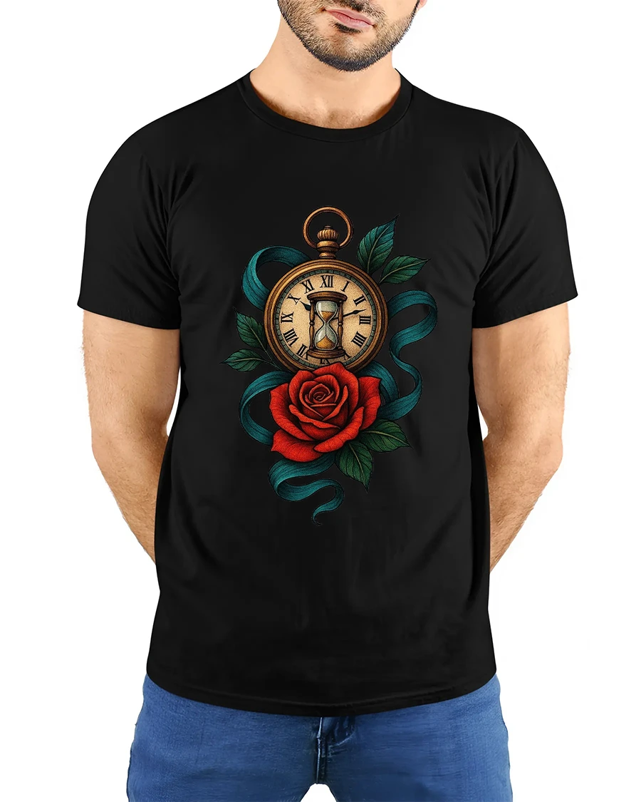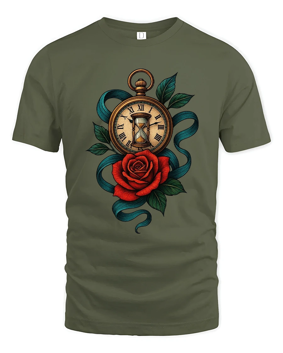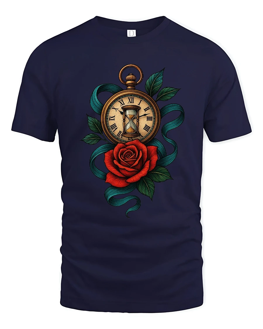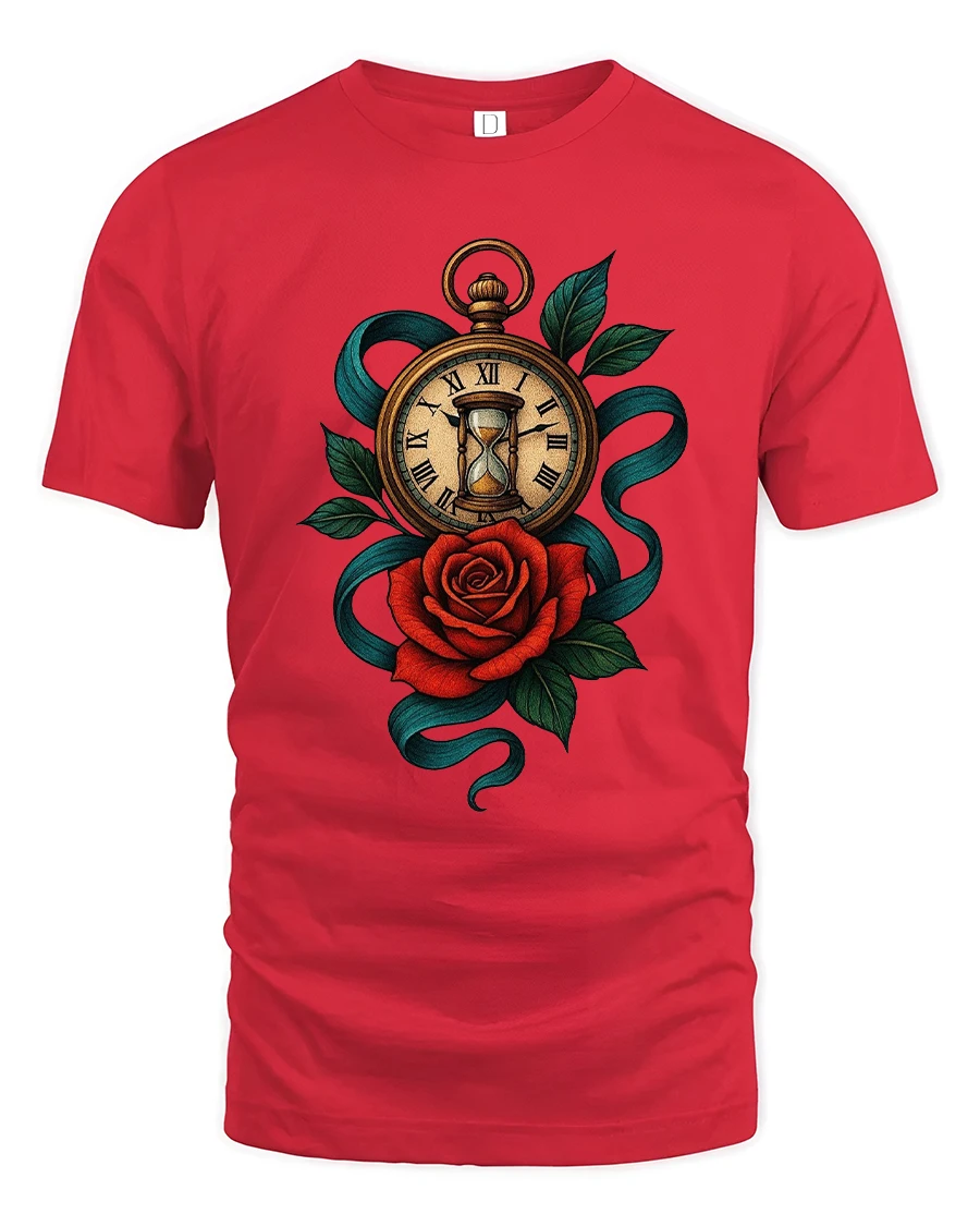 The Timeless Rose Pocket Watch Vintage Art Graphic Tshirt blends romance symbolism and classic beauty into one elegant design.