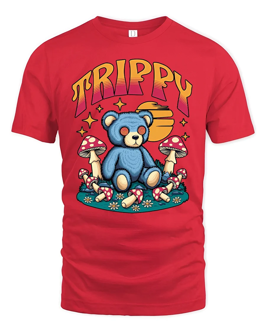Trippy Teddy Bear Psychedelic Mushrooms Retro Vibe Graphic Tee delivers a bold, groovy, and colorful design perfect for anyone who loves psychedelic art and retro aesthetics. Featuring a wide-eyed blue teddy bear sitting among vibrant red mushrooms under a sunset sky, this graphic tee blends nostalgia, fantasy, and trippy vibes in a single striking design. The bold “TRIPPY” lettering adds extra personality, making the shirt instantly eye-catching and unforgettable.
