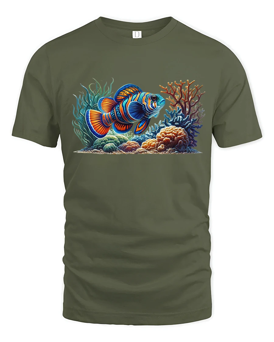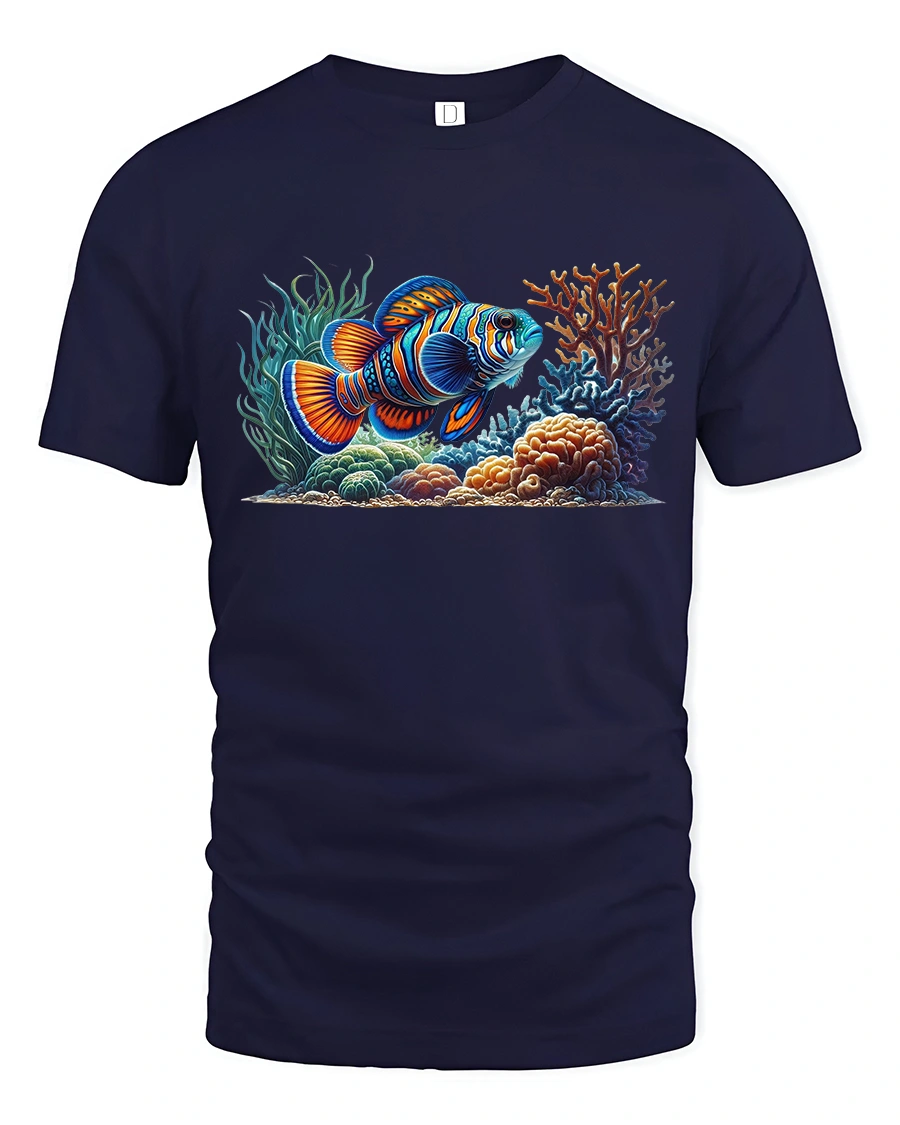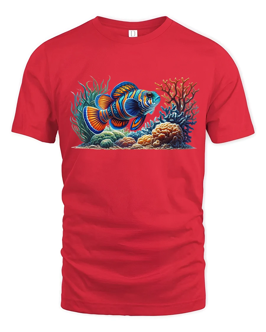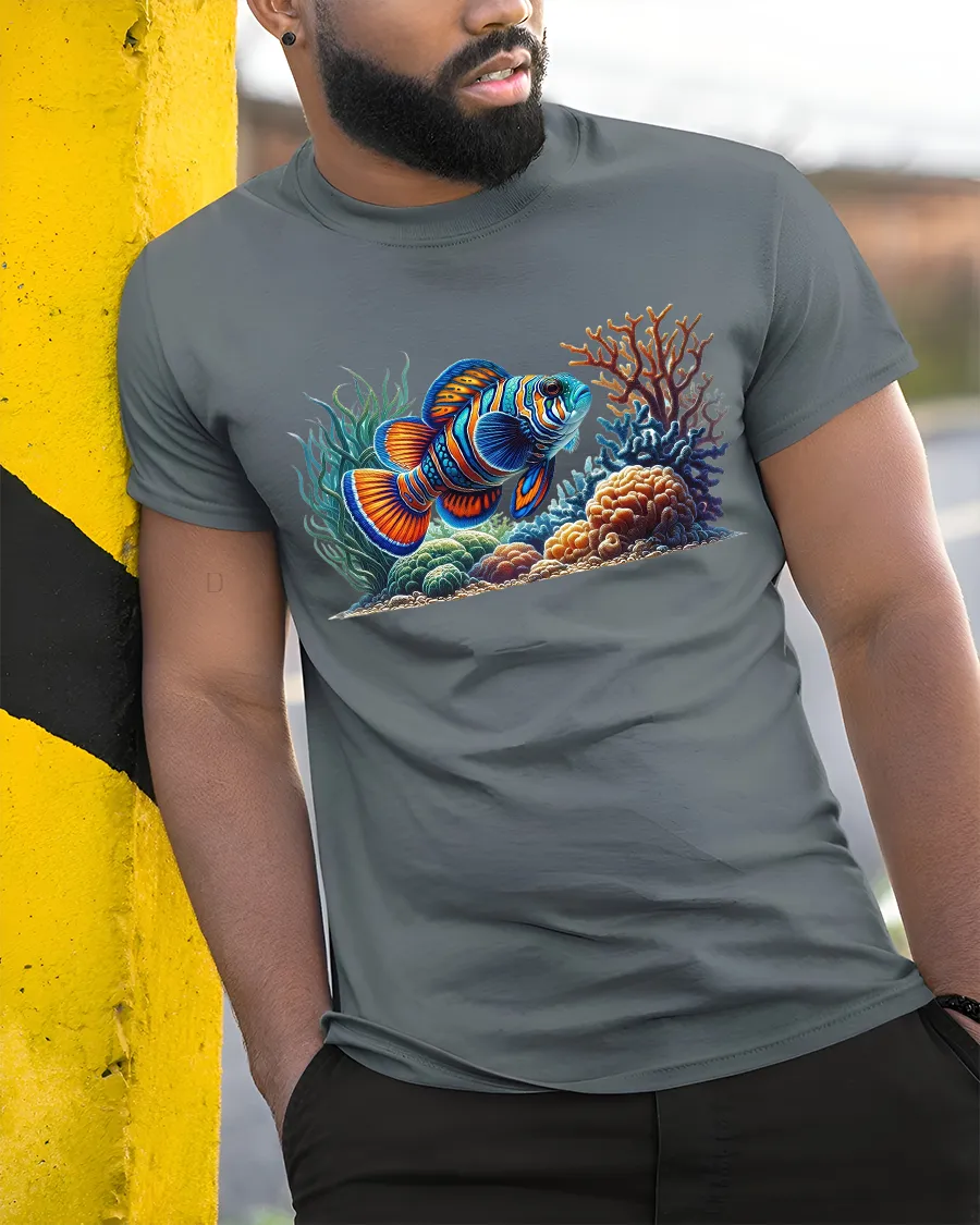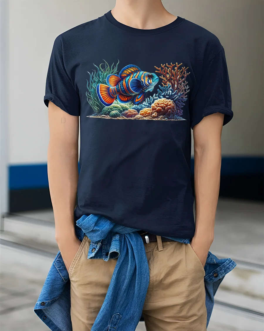The high-quality print showcases every detail — from the shimmer of the fish’s scales to the glow of the coral reef — making it a statement piece for summer outings, beach trips, or casual wear.
