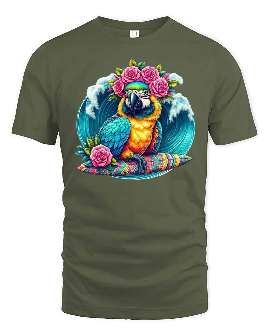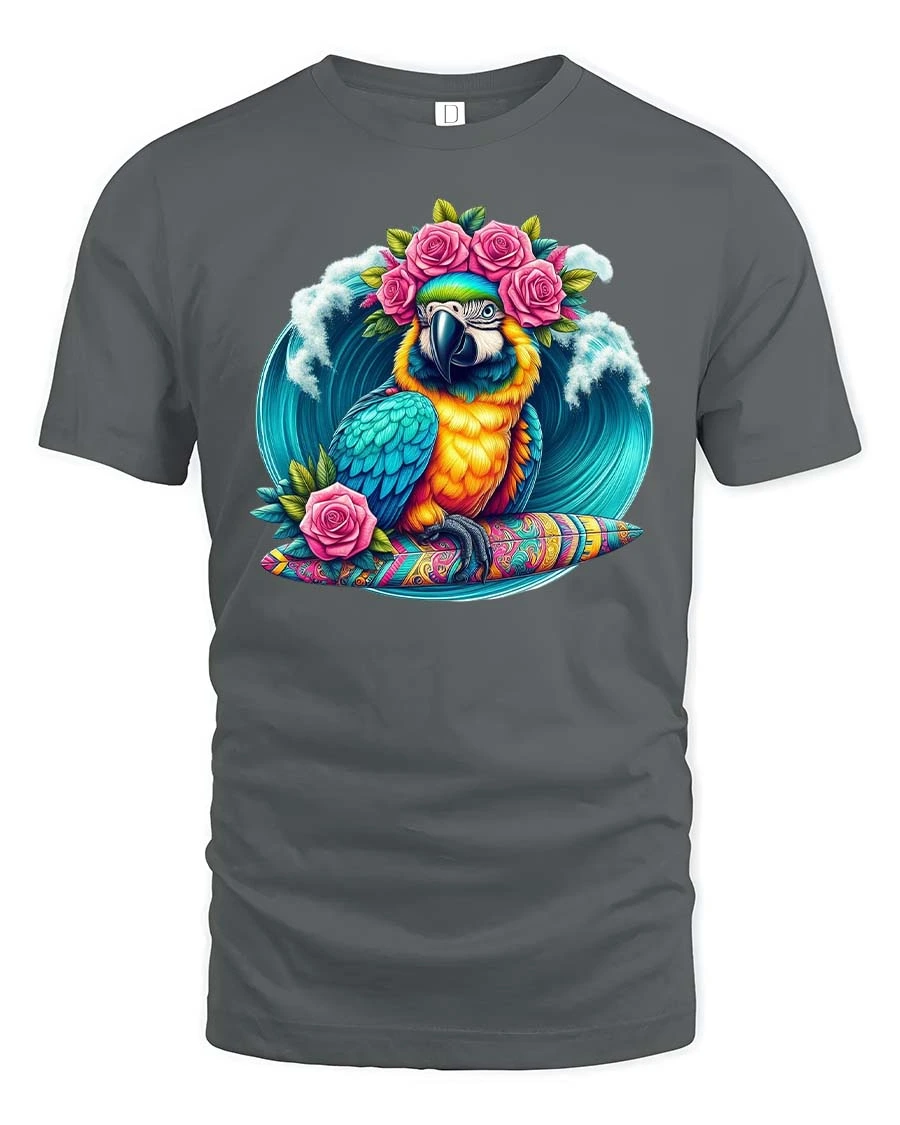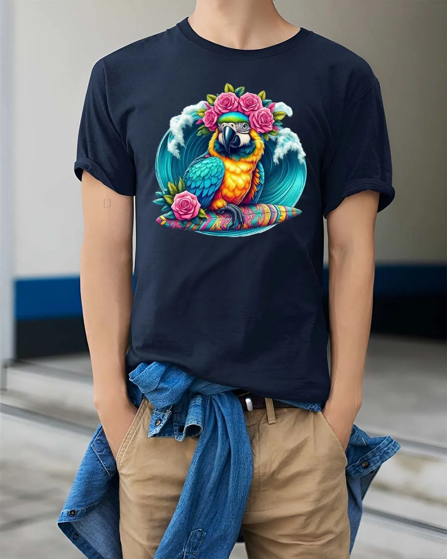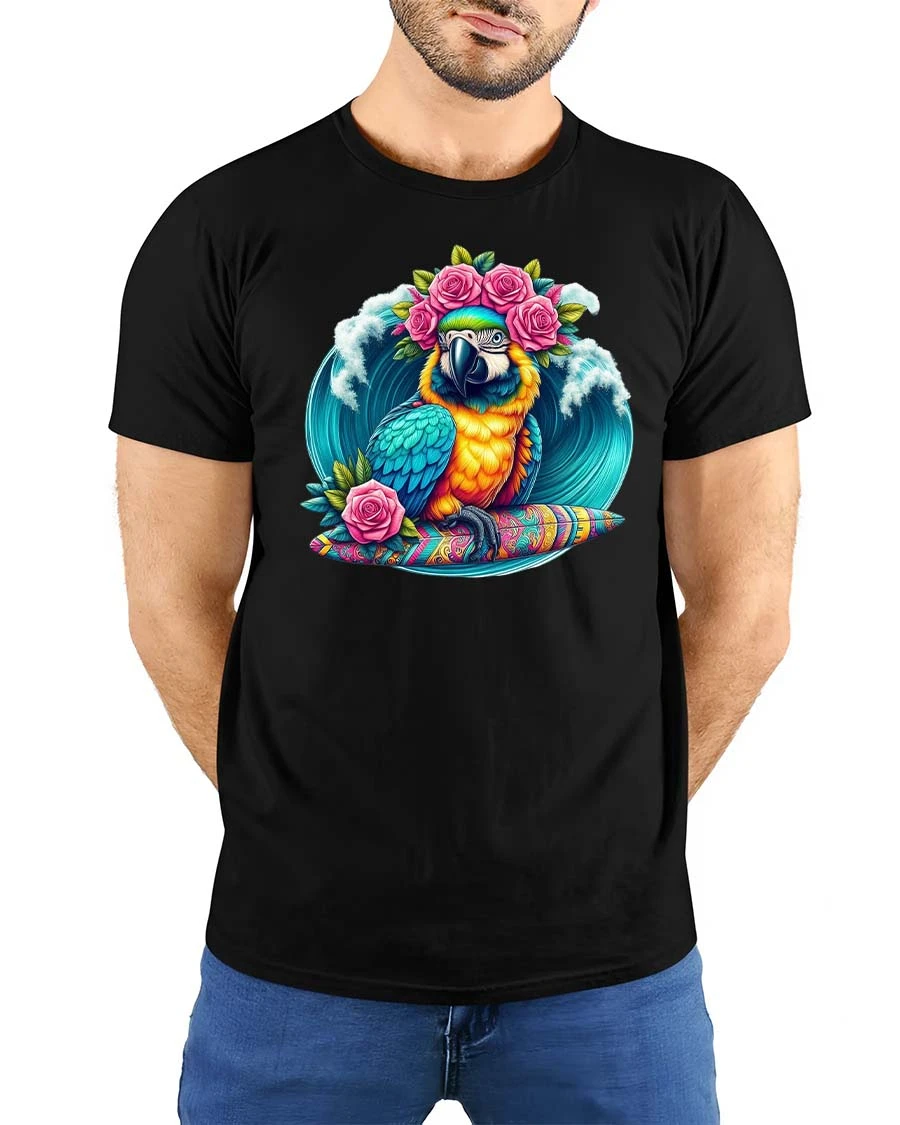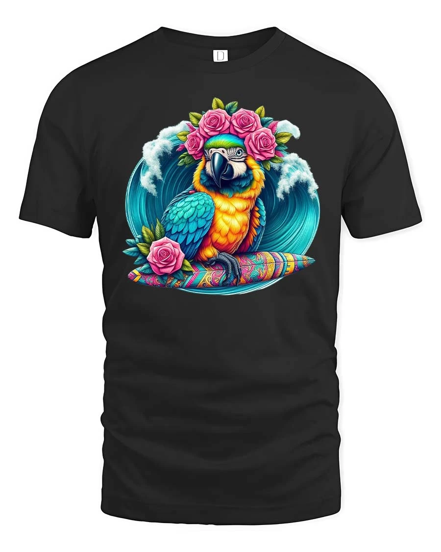 Made from soft and comfortable material, this tropical parrot t-shirt is perfect for beach trips, vacations, summer parties, or casual warm-weather outfits. The high-quality print maintains its rich colors and crisp details wash after wash, making it a staple for anyone who loves bright, artistic, and tropical-themed apparel. Its lively surf-style aesthetic appeals to ocean lovers, bird enthusiasts, and fans of bold, colorful graphics.