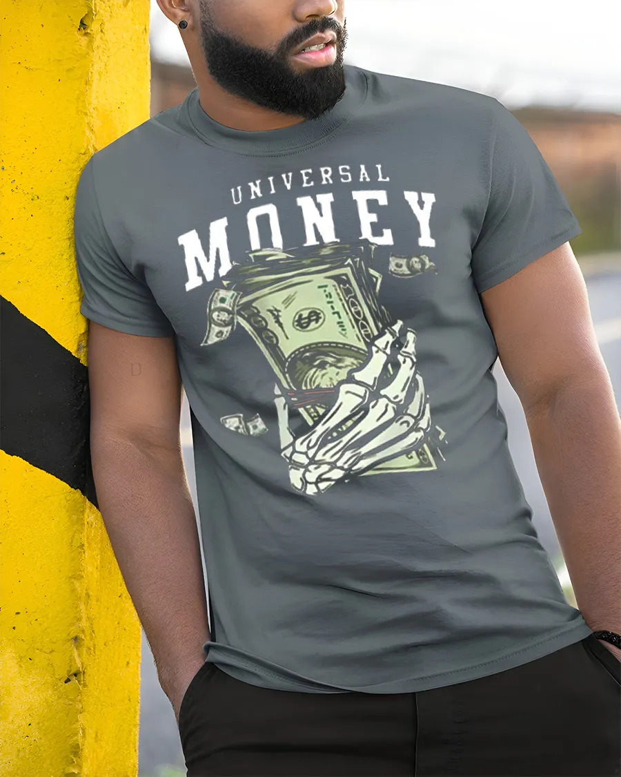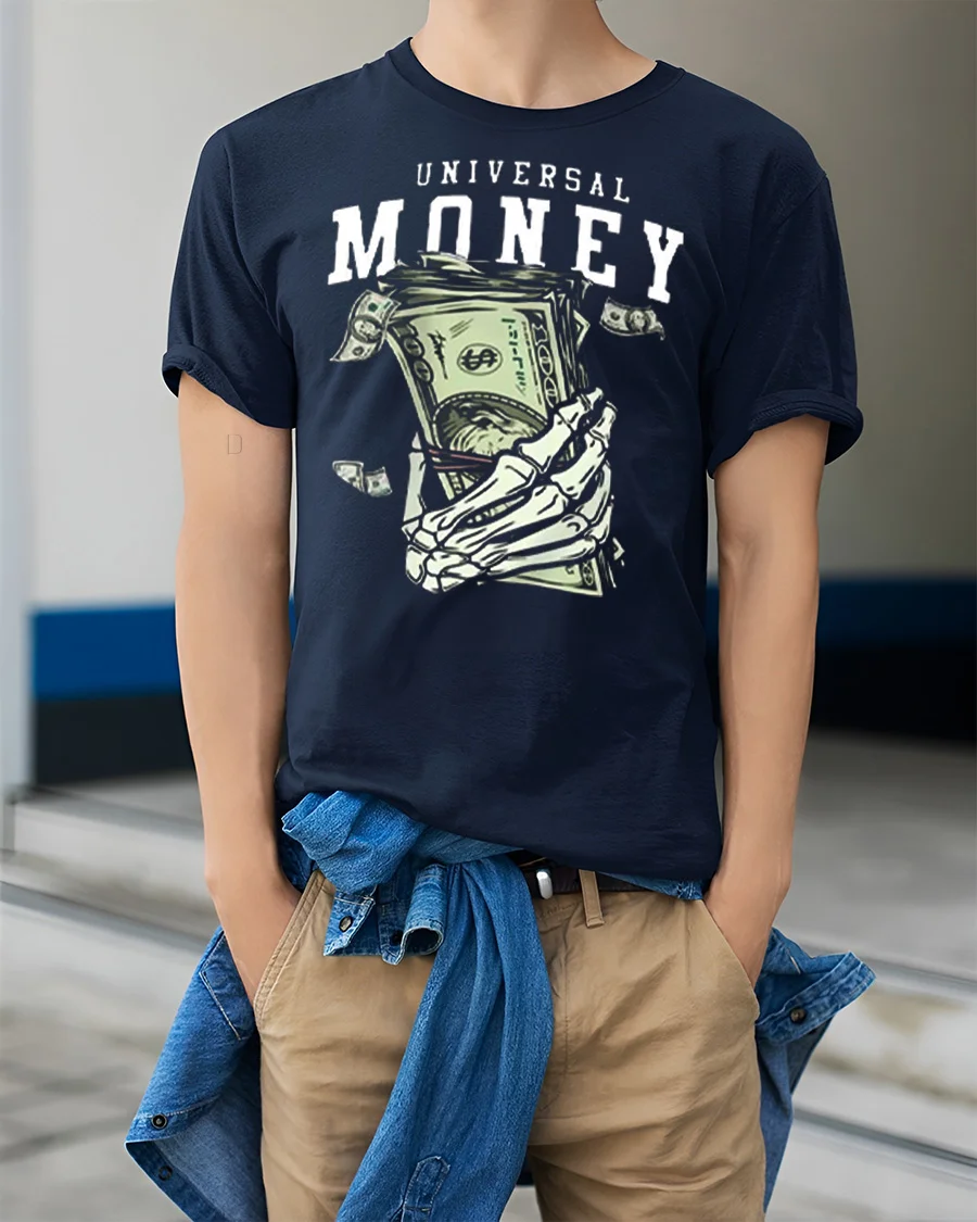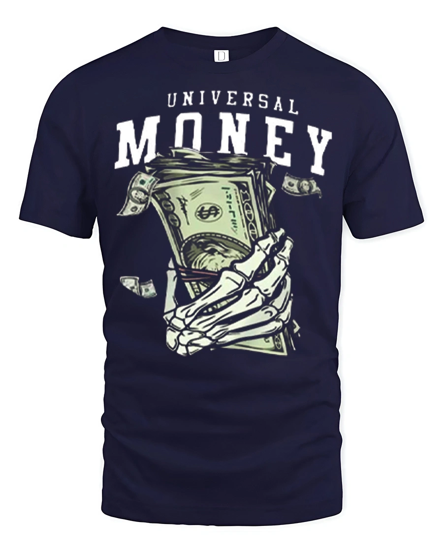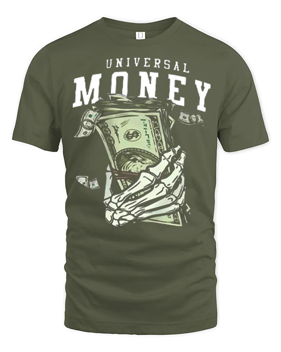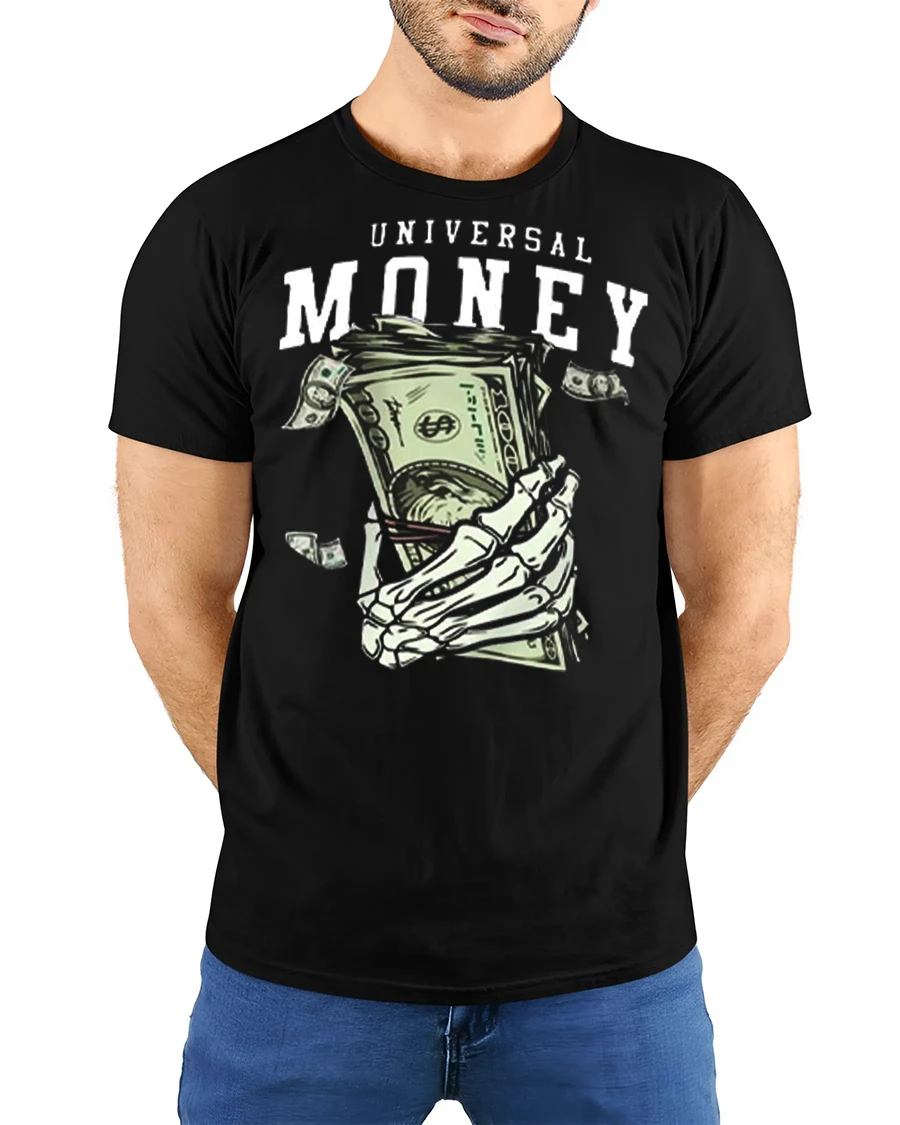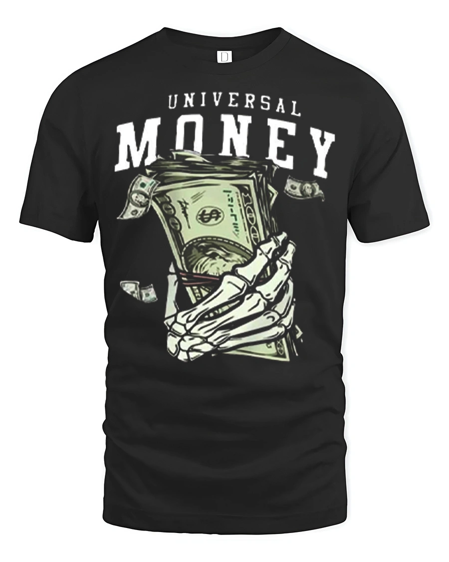 The Universal Money Skeleton Hand Holding Cash Graphic Tee Shirt presents a bold and edgy illustration that captures the powerful theme of money and ambition.