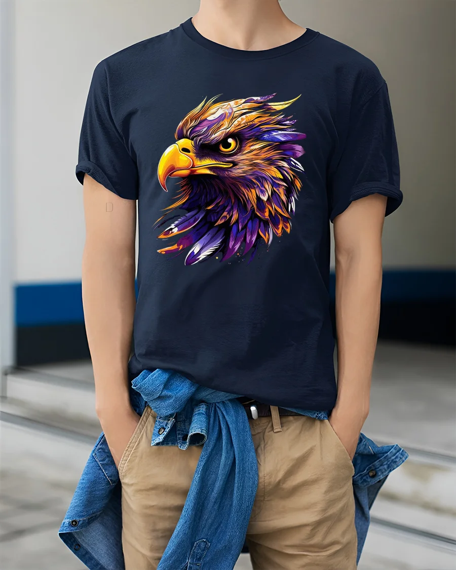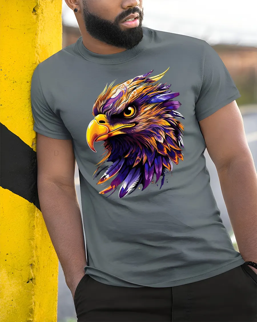 This Vibrant Eagle Art Tee for Bold American Wildlife Style is a powerful and artistic statement piece designed for anyone who loves strong, expressive, and colorful animal graphics. The tee features a fierce eagle head illustrated with bold strokes, intense lines, and striking blends of purple, gold, orange, and white. Its fiery expression and highly detailed feathers make this shirt perfect for those who want to stand out with confidence and American spirit.