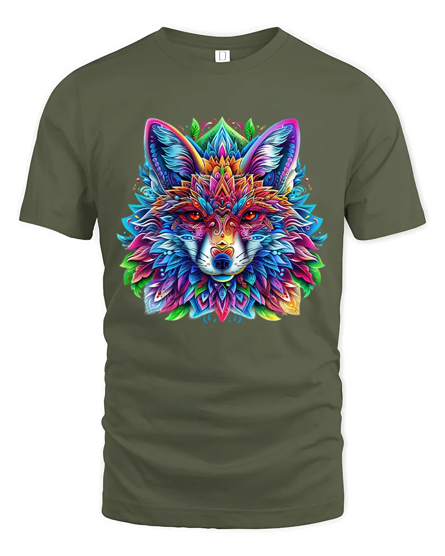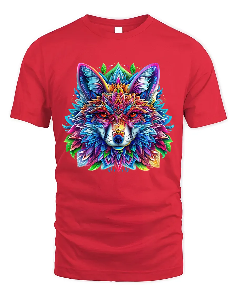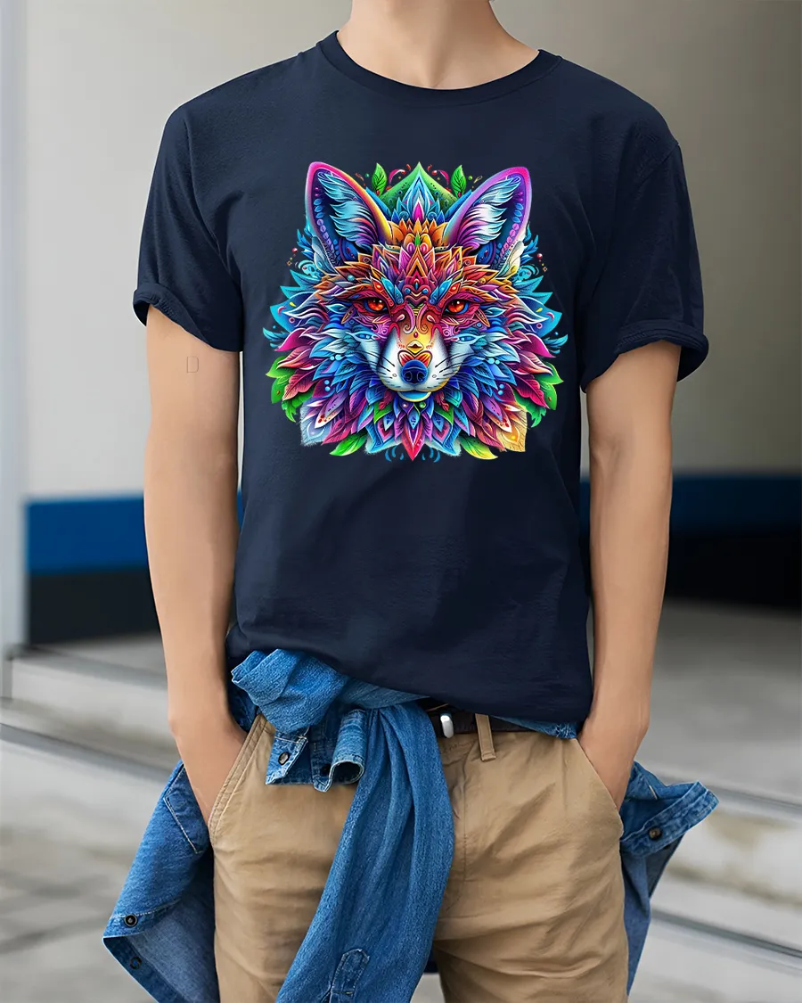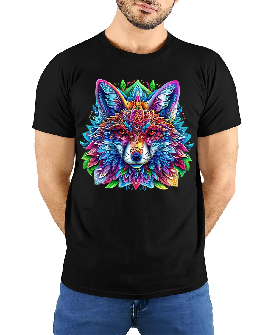 The Vibrant Mandala Wolf T Shirt With Sacred Geometry Art Style showcases a striking fusion of wildlife symbolism and modern artistic design.