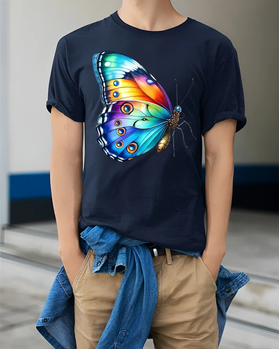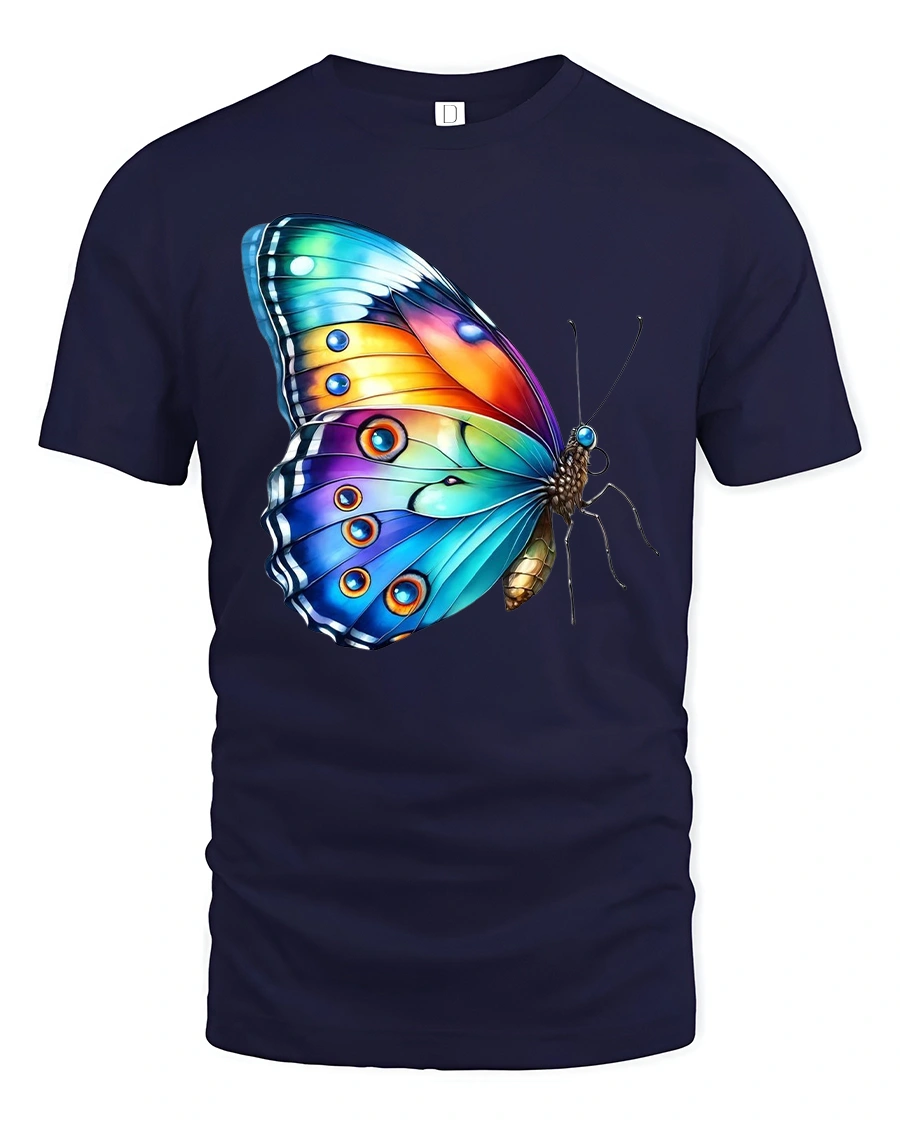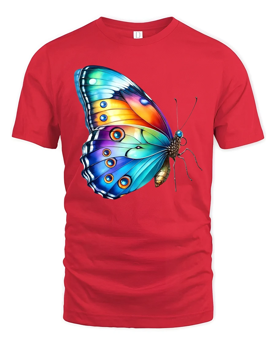 Vibrant Rainbow Butterfly Art Colorful Graphic Tee offers a stunning burst of color and creativity for anyone who loves nature-inspired designs. The beautifully detailed butterfly features radiant shades of blue, orange, green, purple, and yellow, creating an eye-catching look that instantly stands out. Its intricate wing patterns and vivid highlights bring a sense of motion, freedom, and artistic flair to your everyday outfit.