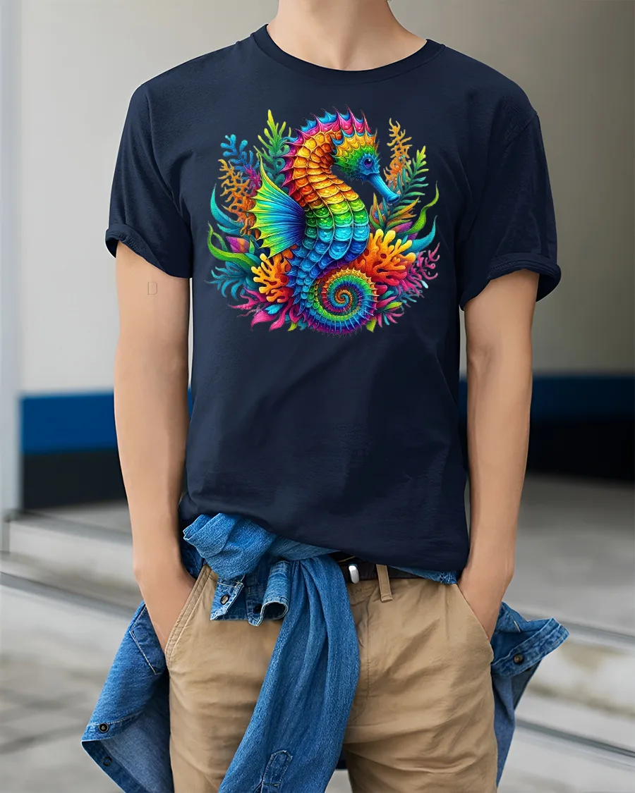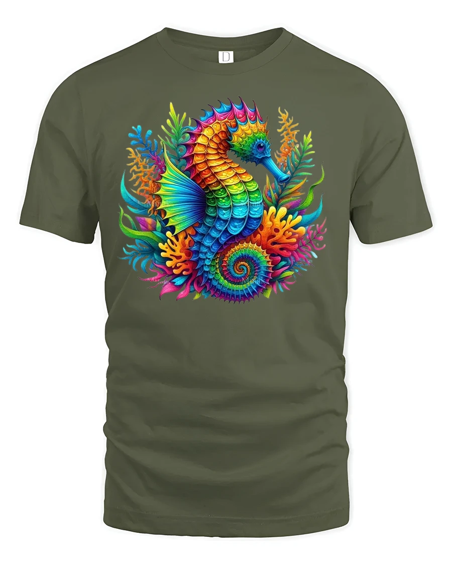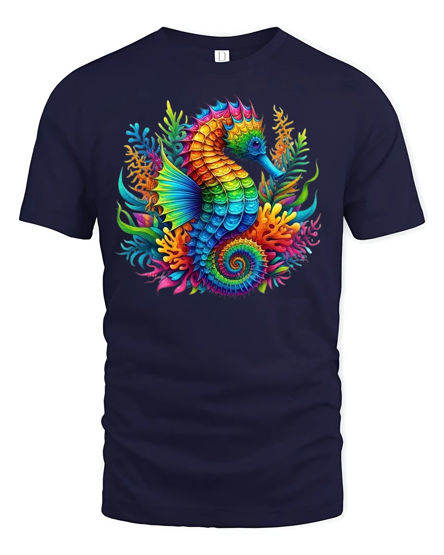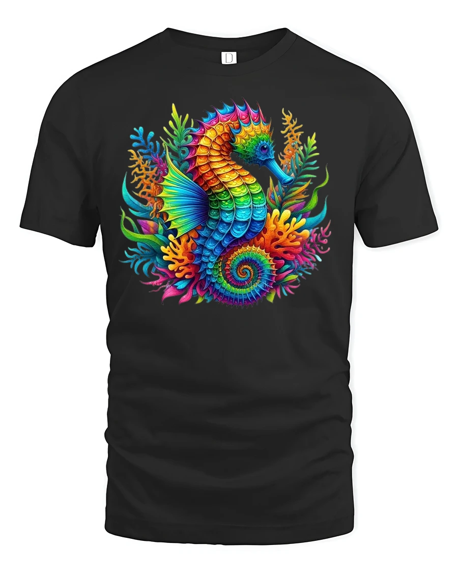 Featuring a detailed rainbow seahorse surrounded by vivid coral and sea plants, this shirt captures the beauty and magic of the underwater world.