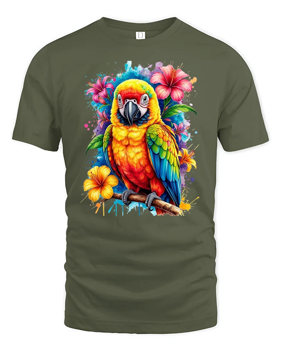 This Vibrant Tropical Parrot Graphic Tee Colorful Jungle Bird Tshirt features a bold and eye-catching design perfect for lovers of exotic wildlife and tropical art. The brilliantly colored parrot sits proudly on a branch surrounded by tropical hibiscus flowers and splashes of vivid paint, creating a dynamic and lively look that instantly stands out. The detailed artwork gives this tee a premium, artistic feel that appeals to both nature lovers and fans of bright, expressive designs.