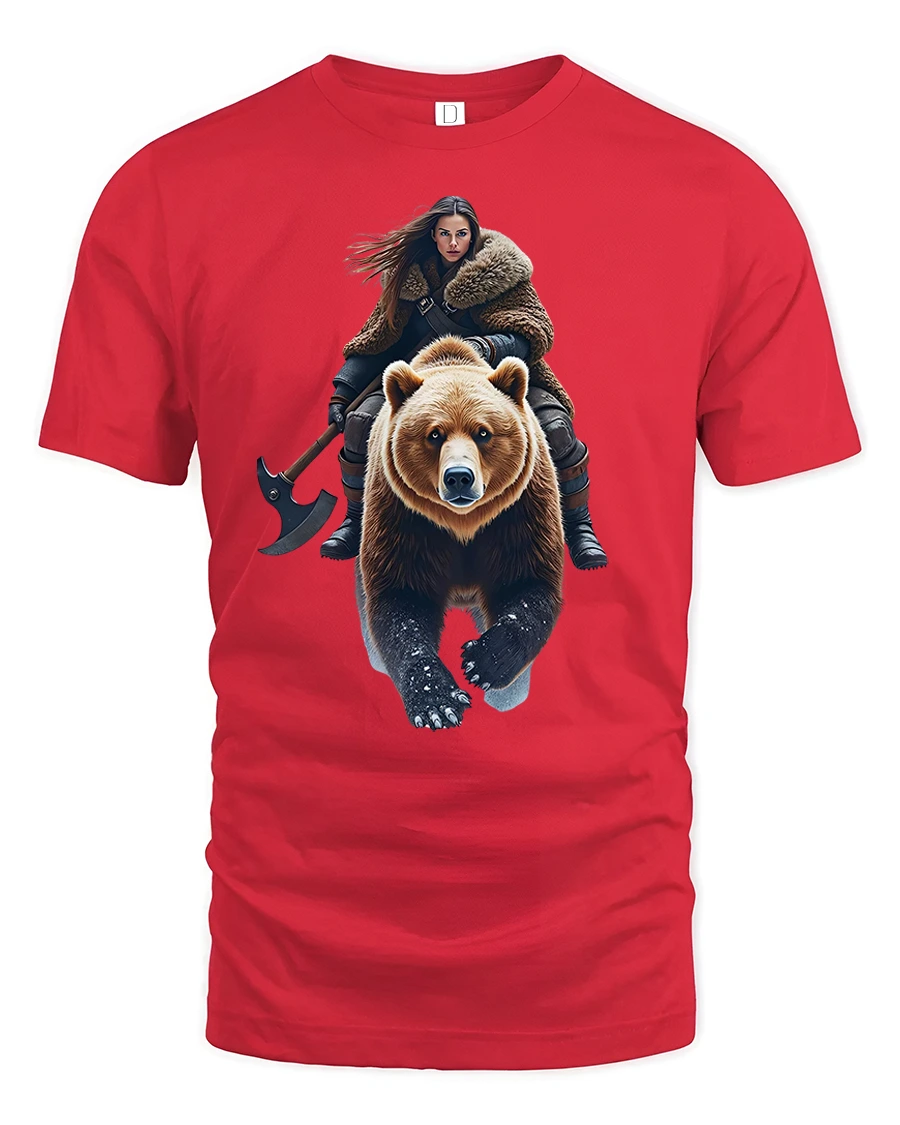 Embrace your inner warrior with the Viking Warrior Woman Riding Bear Epic Power T-Shirt.