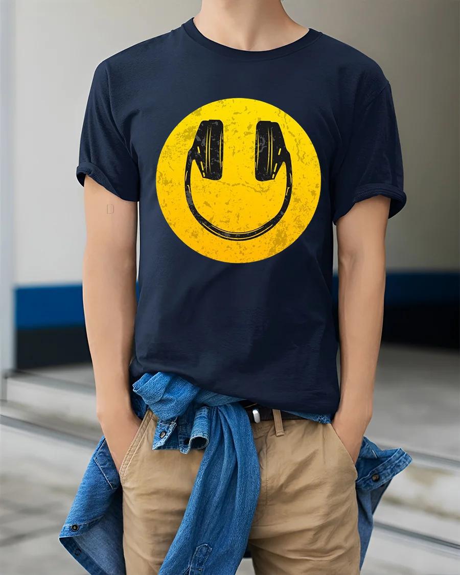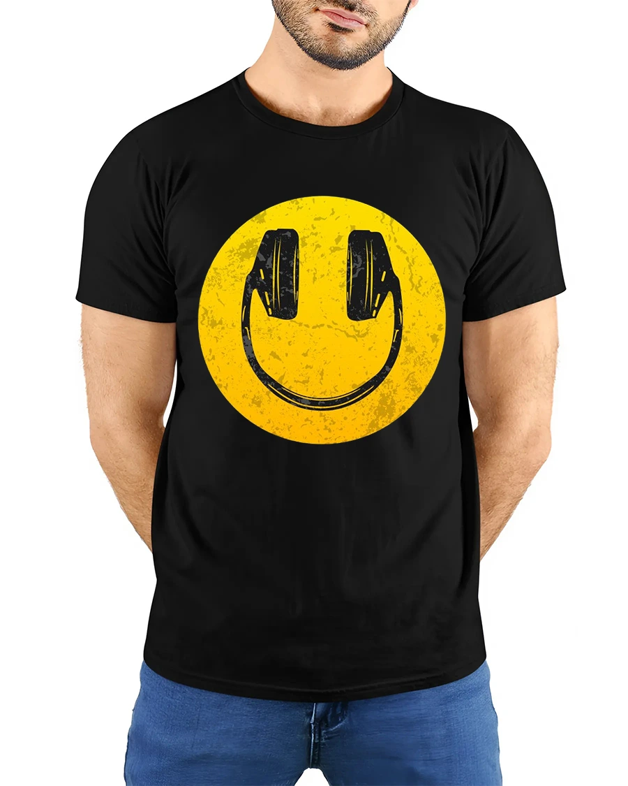 Vintage Smiley Face With Headphones Music Lover Graphic Tshirt is made from soft comfortable fabric suitable for daily wear.