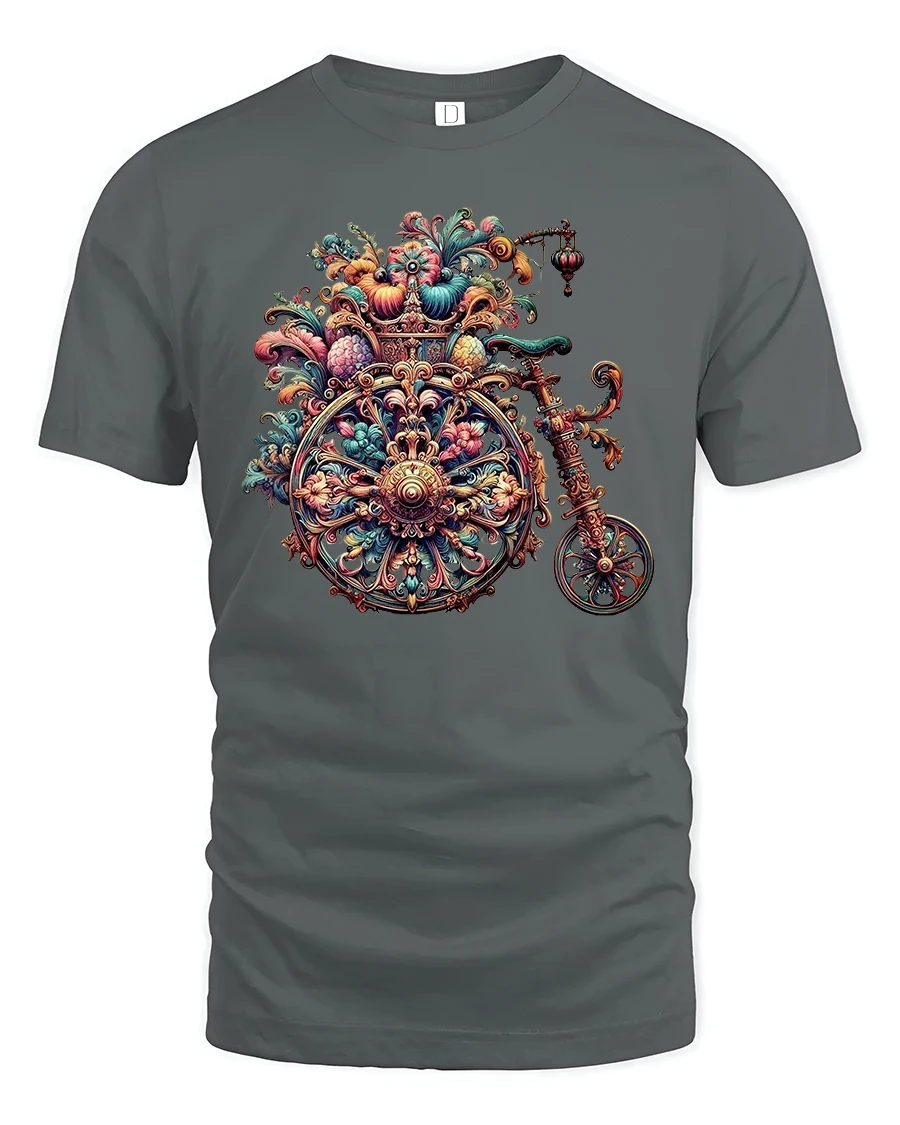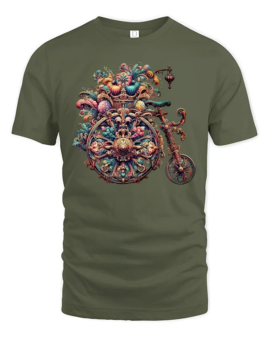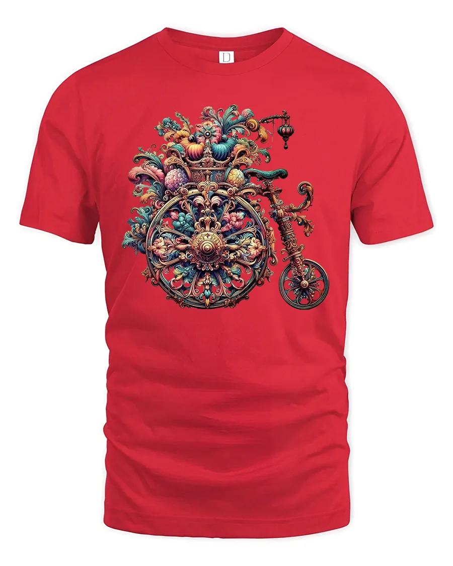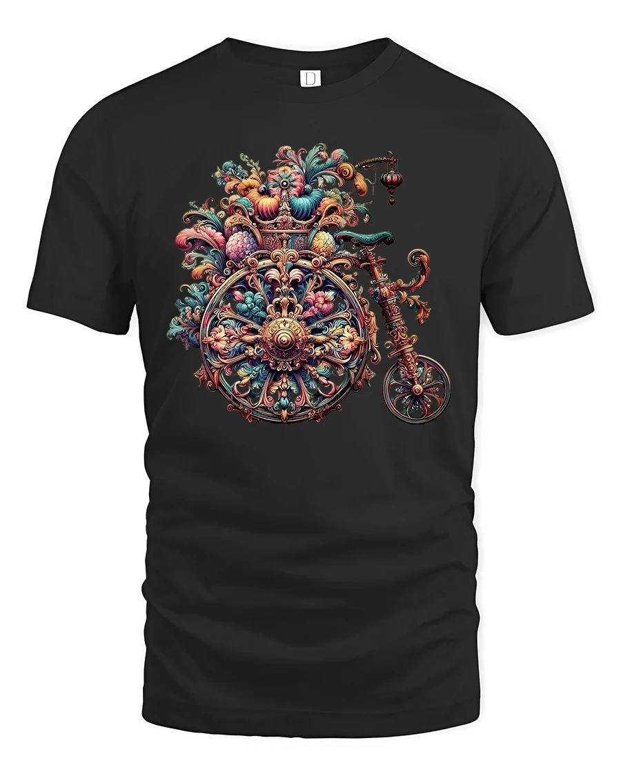 Add a touch of retro elegance and fantasy to your wardrobe with this artistic bicycle t-shirt.