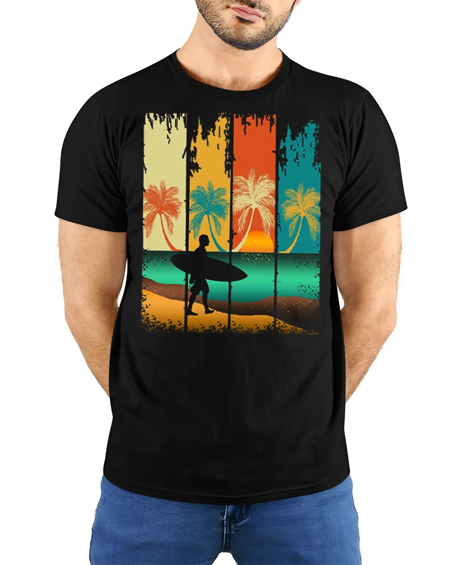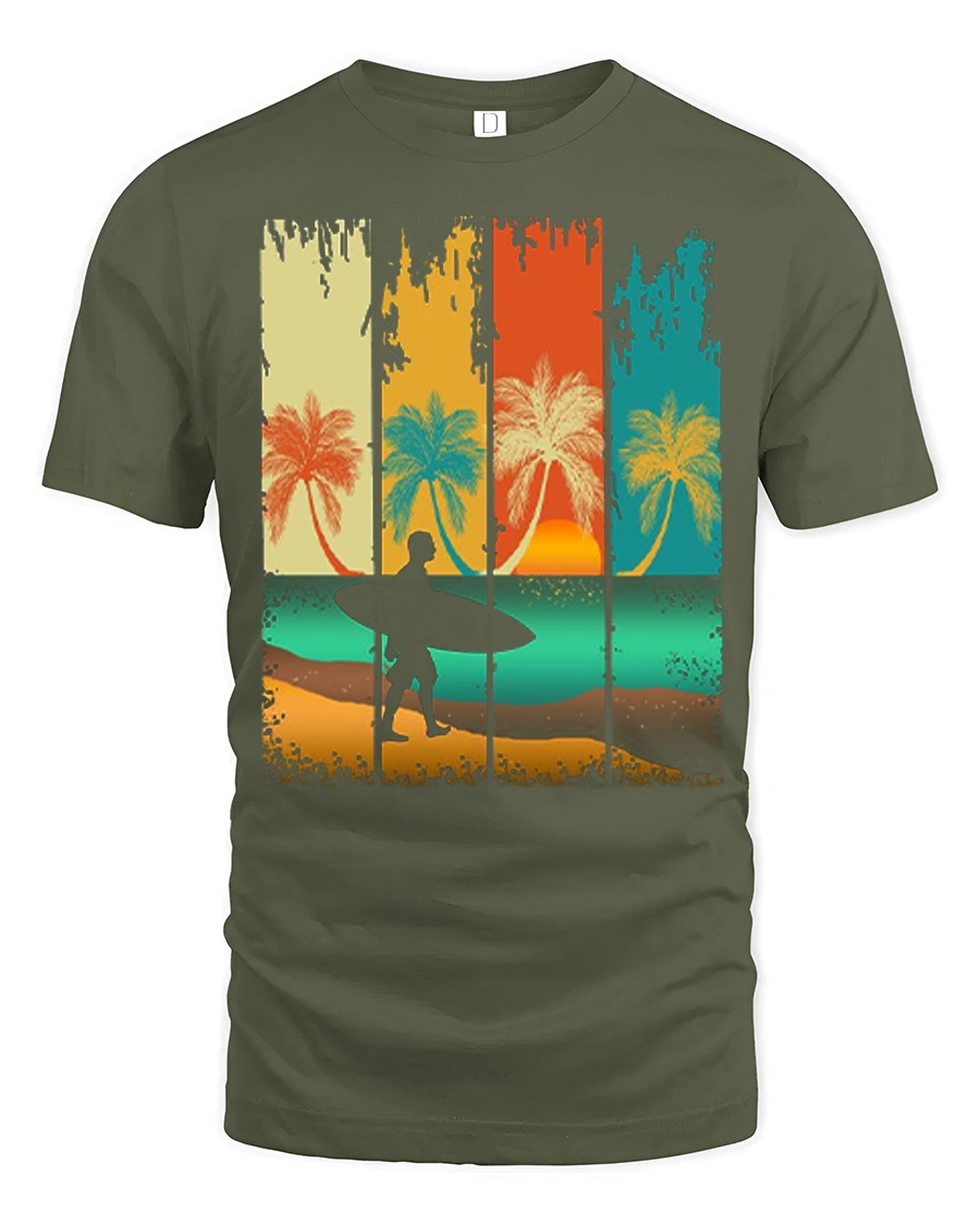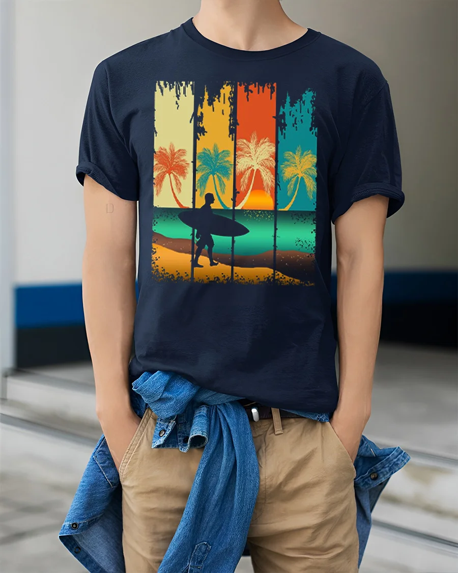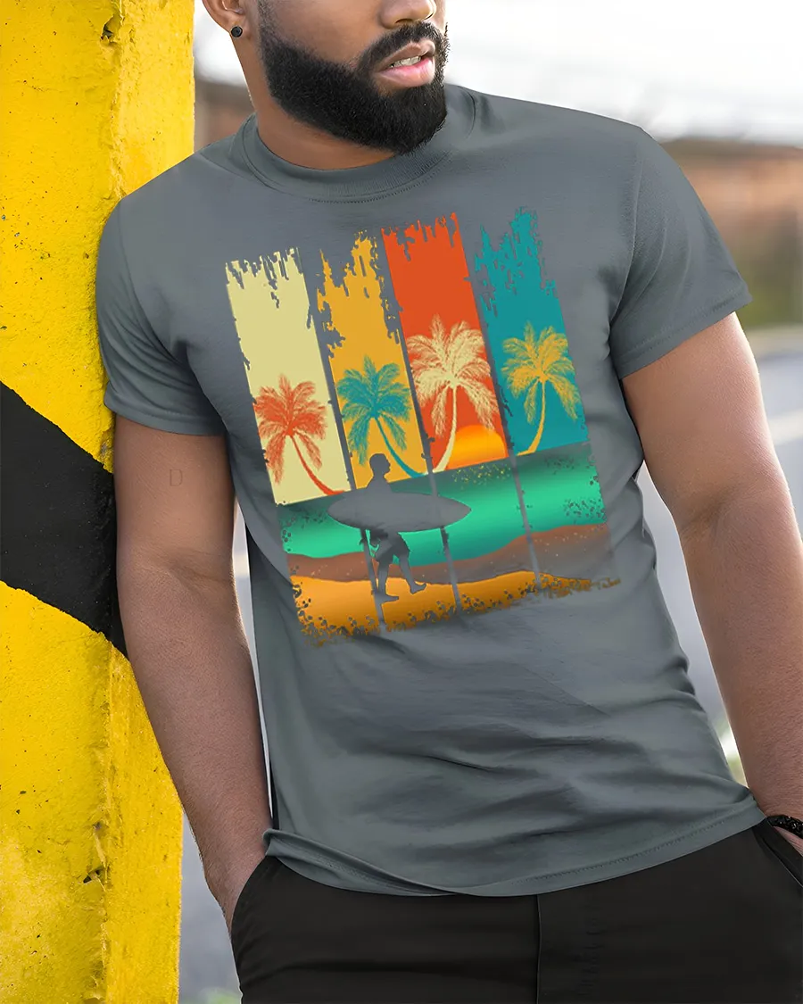 Vintage Surf Sunset Silhouette Graphic Tshirt Beach Vibes Style captures the essence of coastal living with a relaxed artistic touch.