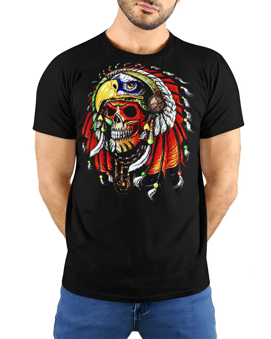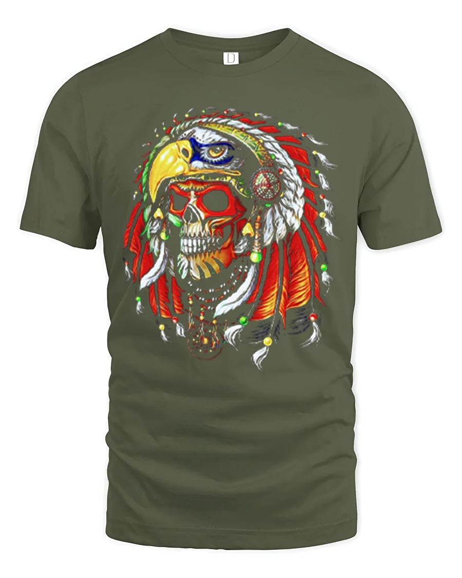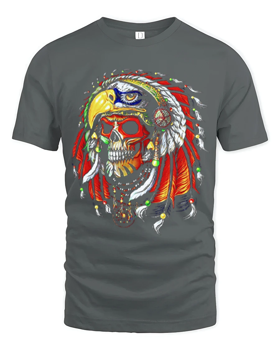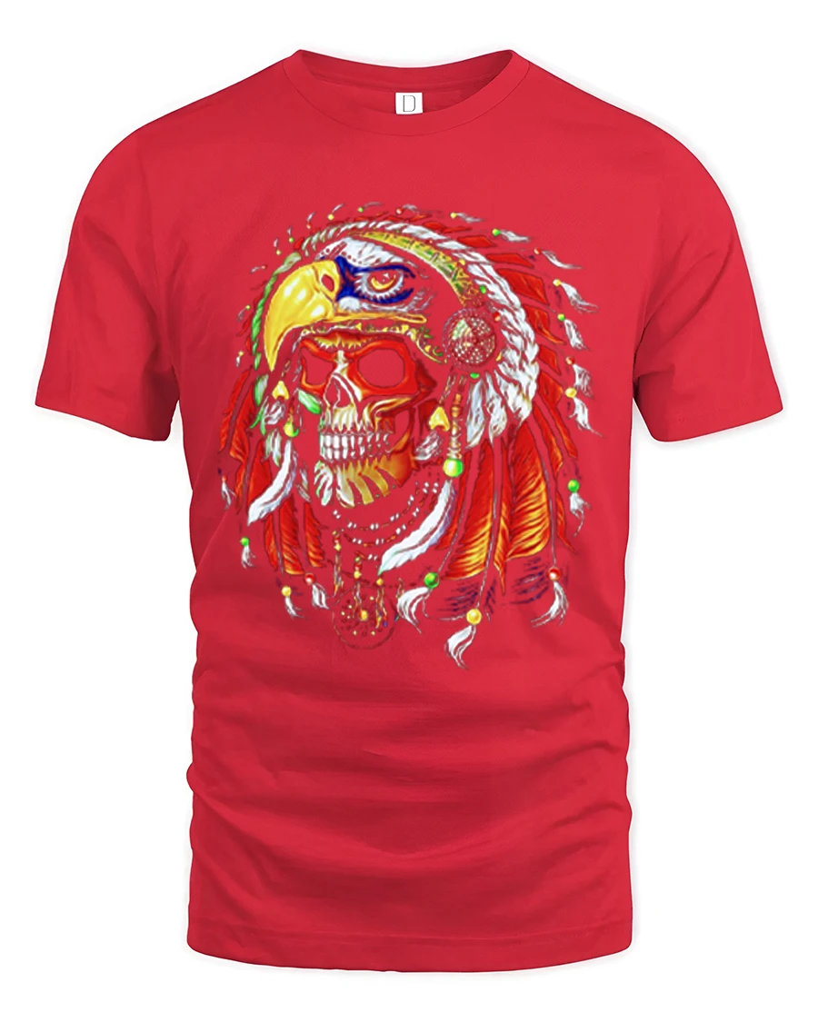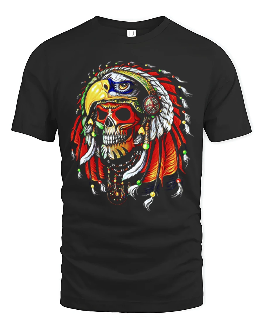 Warrior Skull Eagle Headdress Bold Tribal Art Graphic Tee delivers an intense and visually striking design perfect for fans of powerful artwork and dramatic skull graphics. The illustration features a fierce skull adorned with a brightly detailed eagle-shaped headdress, complete with vibrant feathers, beads, and bold color contrasts. This dramatic and artistic style makes the tee stand out instantly, appealing to those who love warrior-themed, fantasy, or gothic-inspired clothing.