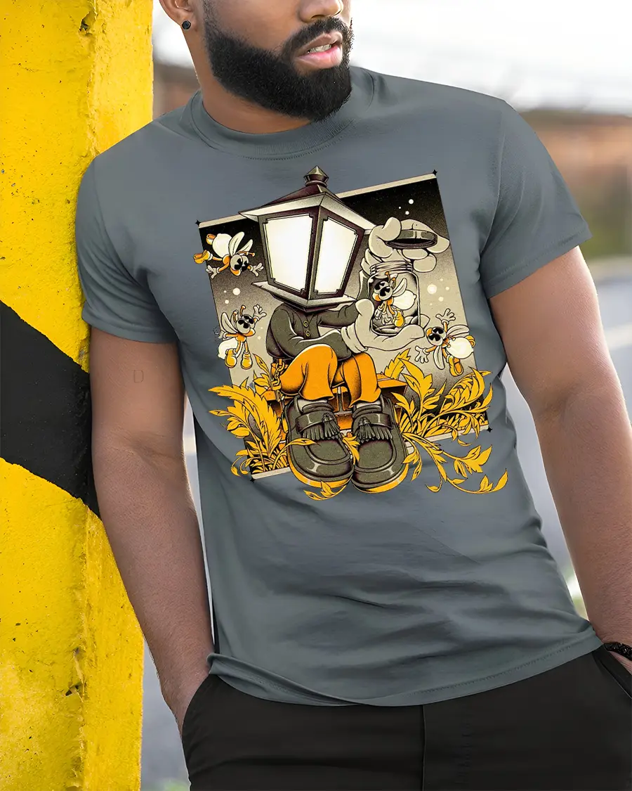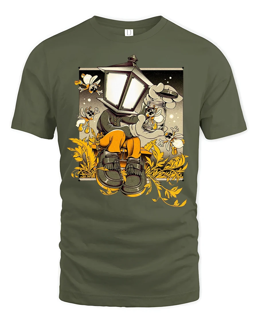Whimsical Street Lamp Man And Fireflies Vintage Cartoon Art Tshirt is made from a soft comfortable fabric designed for daily wear.