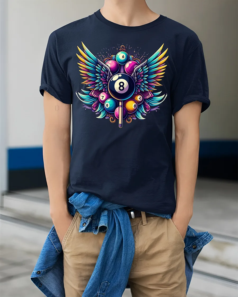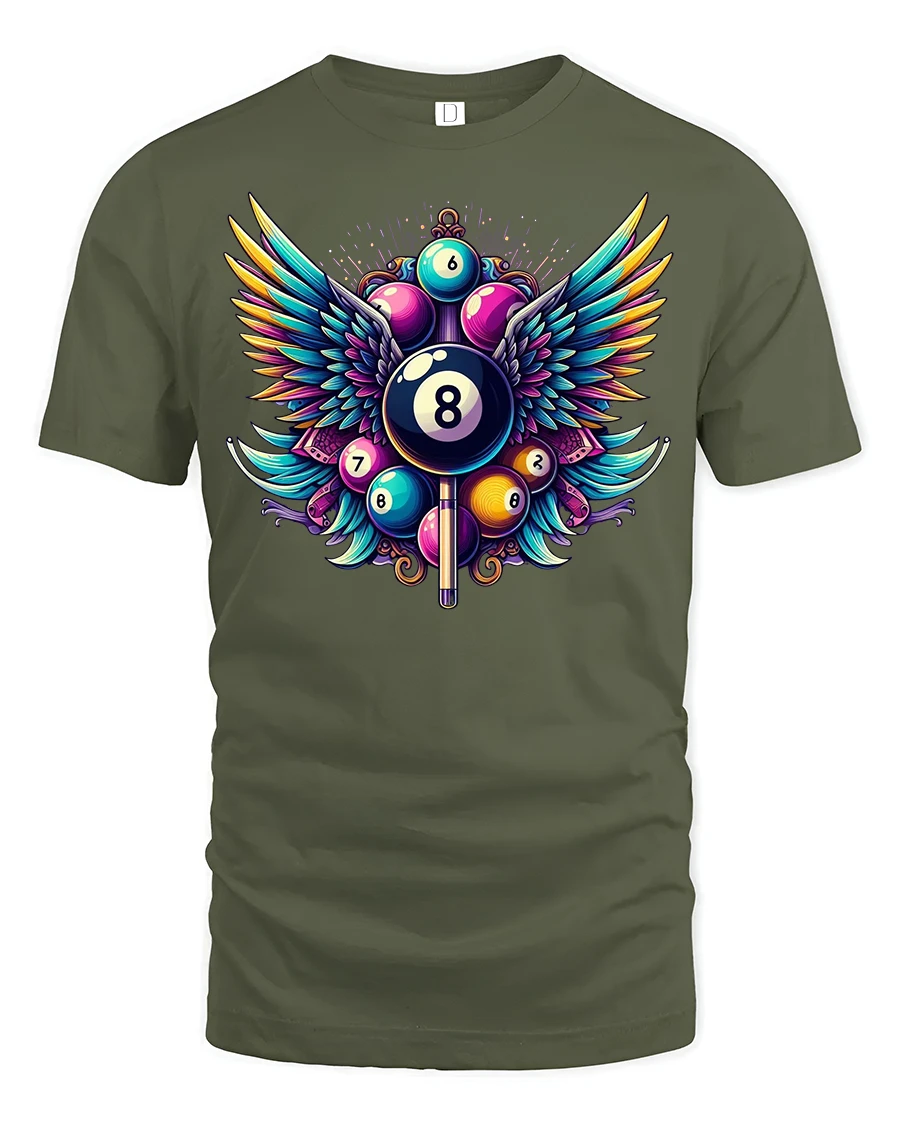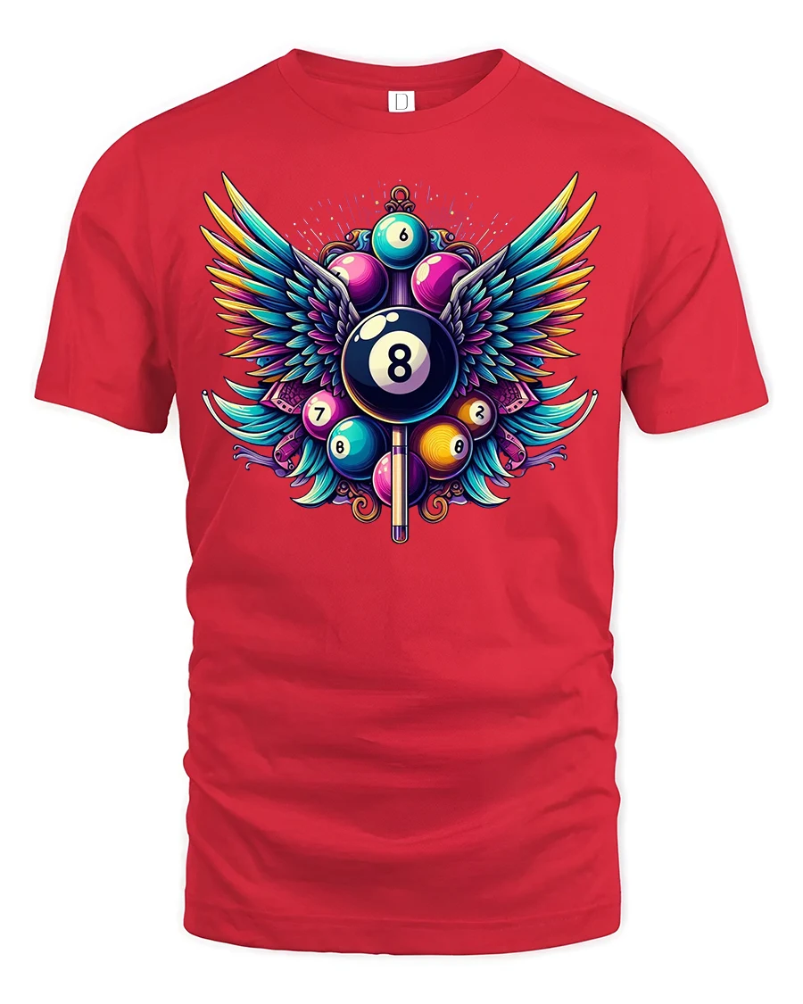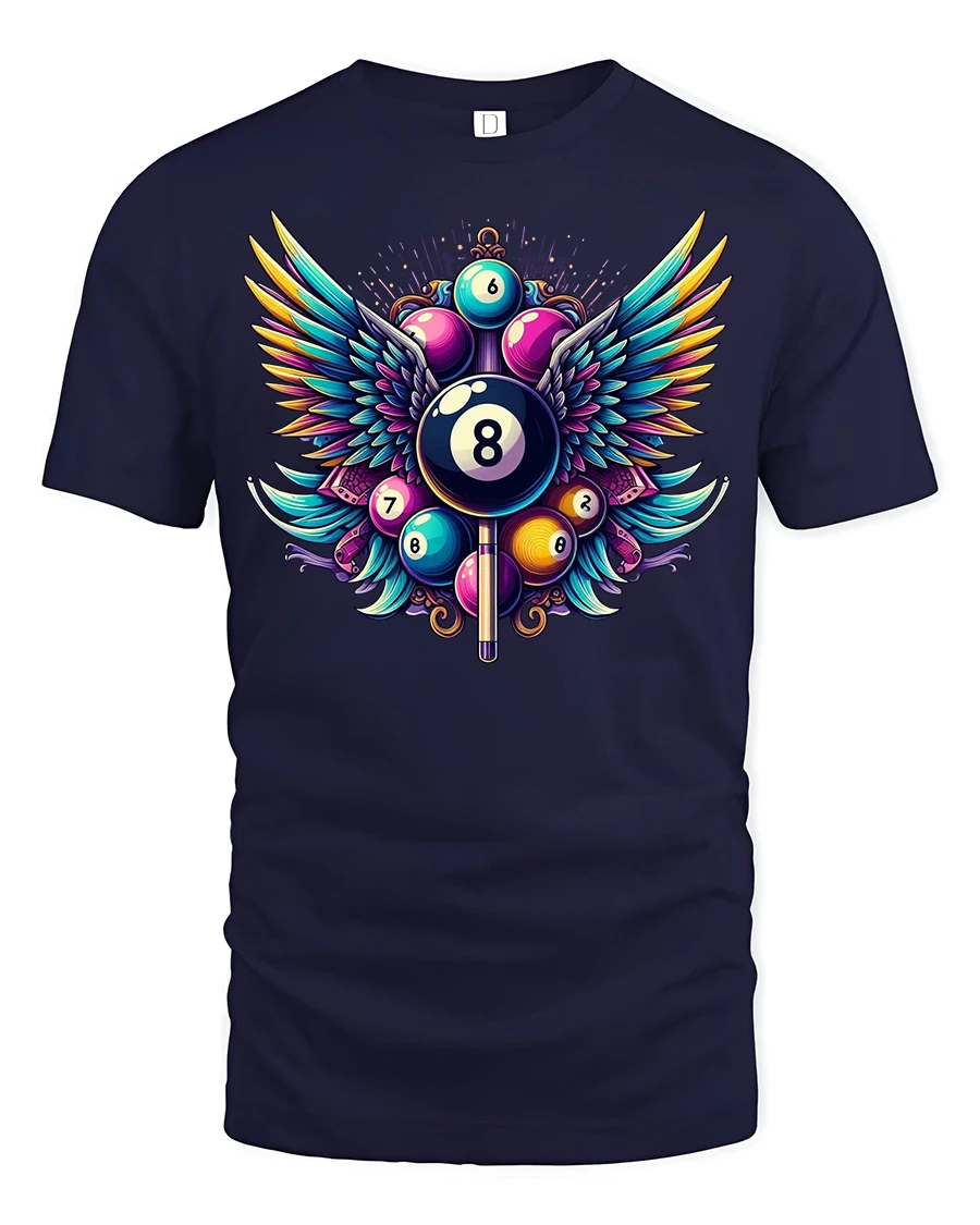 Winged 8 Ball Billiards Pool Graphic Print T-Shirt is the ultimate choice for anyone who loves the thrill of pool and billiards. Featuring a bold and colorful 8-ball design with angel wings, this tee combines vibrant artwork with a passion for the game. It’s perfect for players, fans, or anyone who enjoys fun novelty shirts with a touch of humor and style.