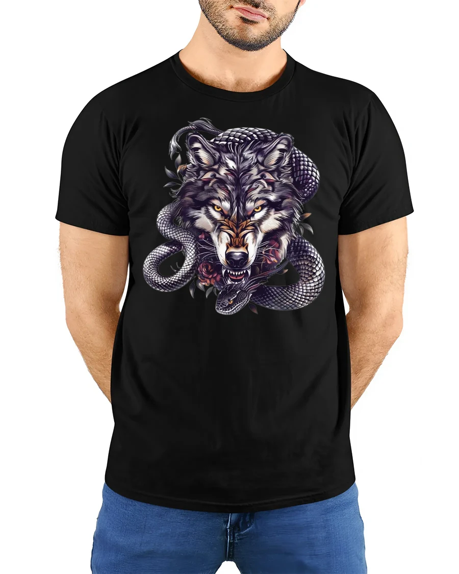 Made from soft, durable cotton, the Wolf and Snake T-Shirt provides comfort while delivering a bold visual impact.