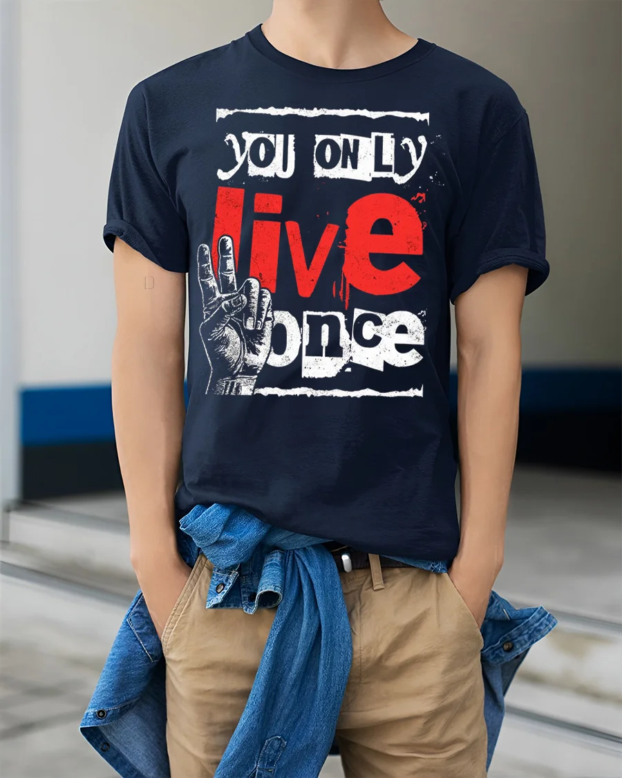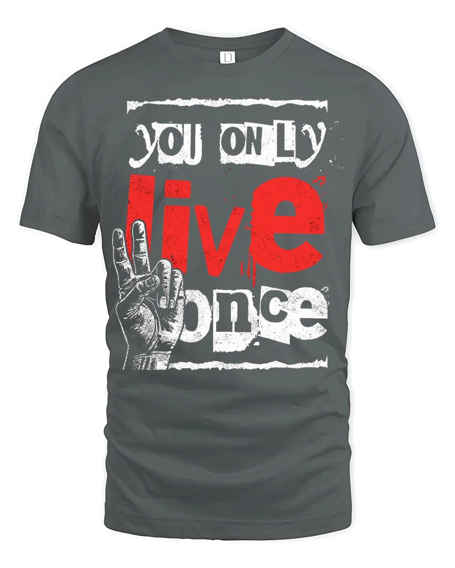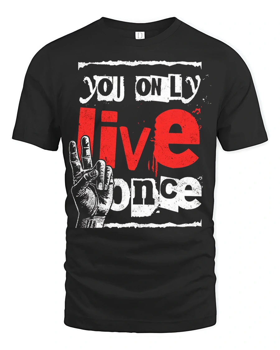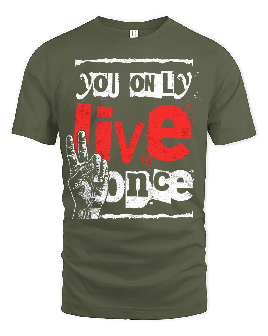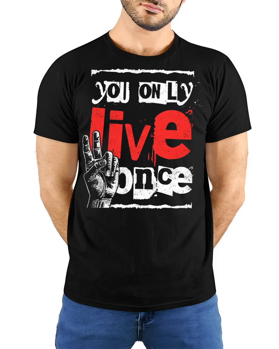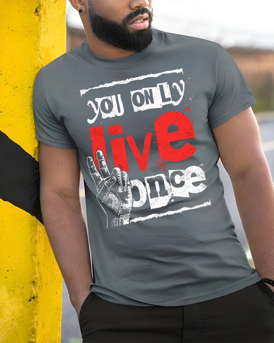 You Only Live Once Motivational Graphic T Shirt features a bold and eye catching typography design that highlights a powerful and inspiring message.